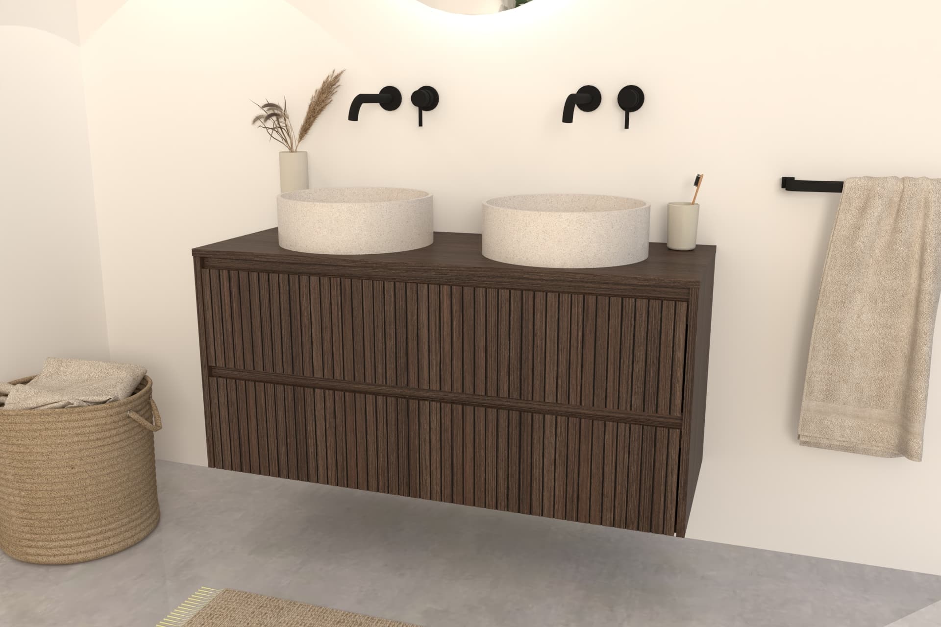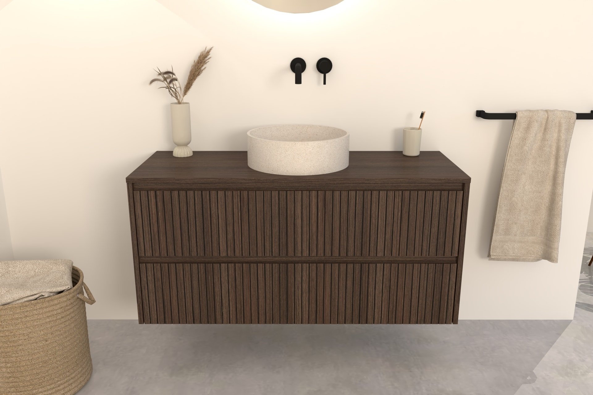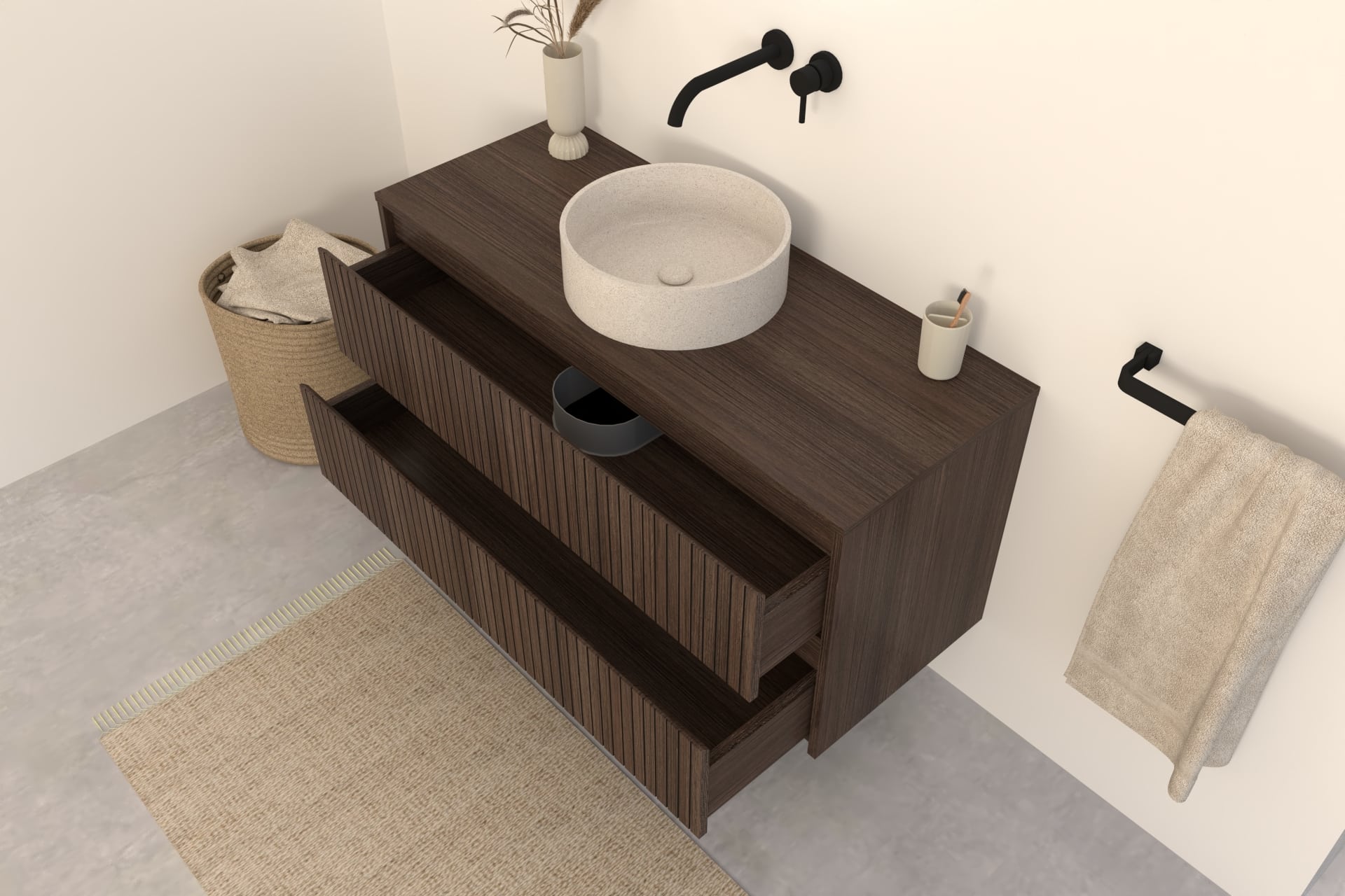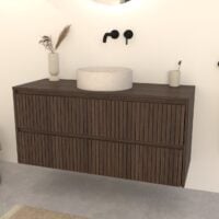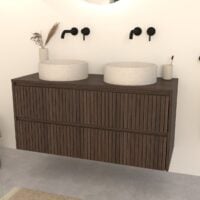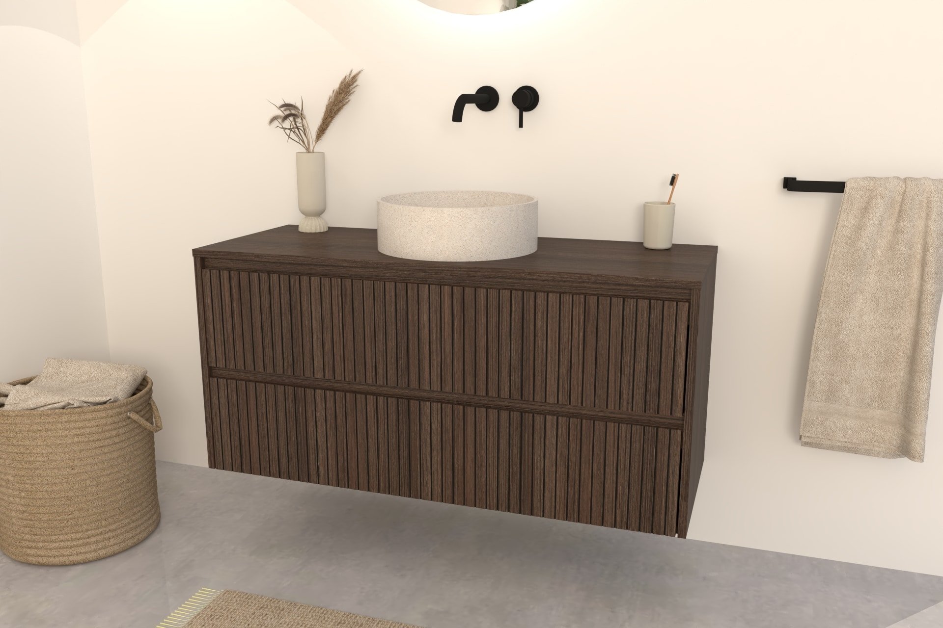 Dunkel Eiche Badmöbel Nila 120 cm – Riffelfront mit 2 Softclose-Schubladen