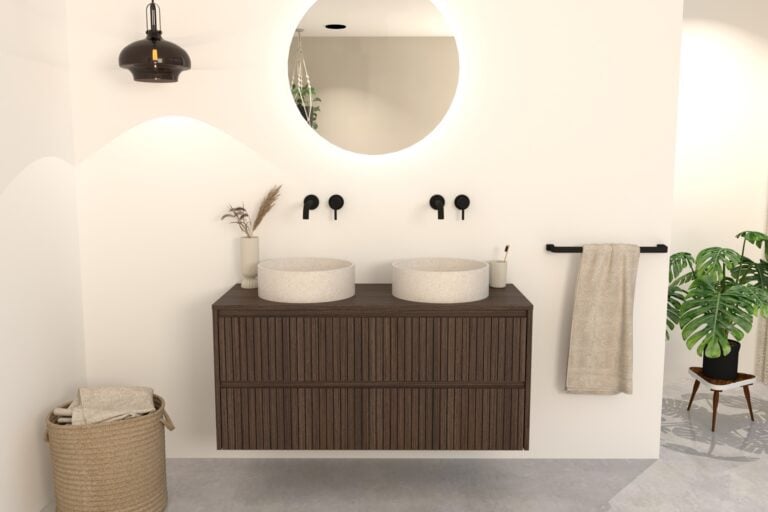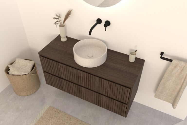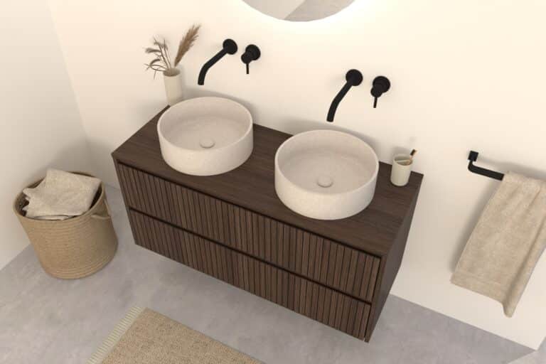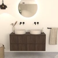 Kombinieren Sie das Nila Badmöbel mit einem passenden Aufsatzwaschbecken aus Naturstein, Terrazzo oder Beton sowie einer stilvollen Waschtischarmatur oder Ablaufgarnitur in z. B. Chrom, Mattschwarz oder Edelstahl.