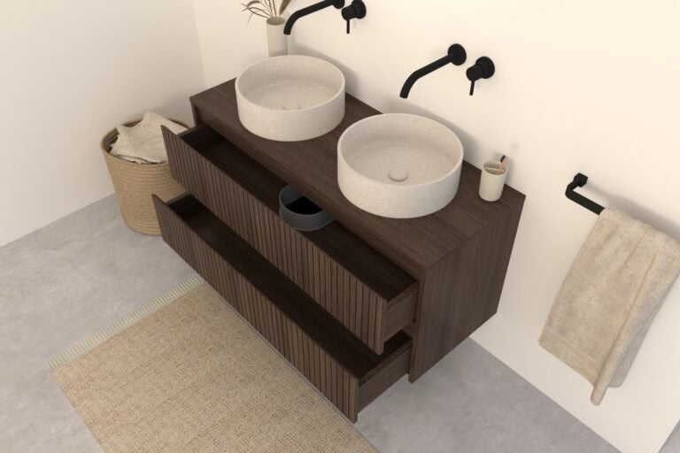 Dunkel Eiche Badmöbel Nila 140 cm – Riffelfront mit 4 Softclose-Schubladen