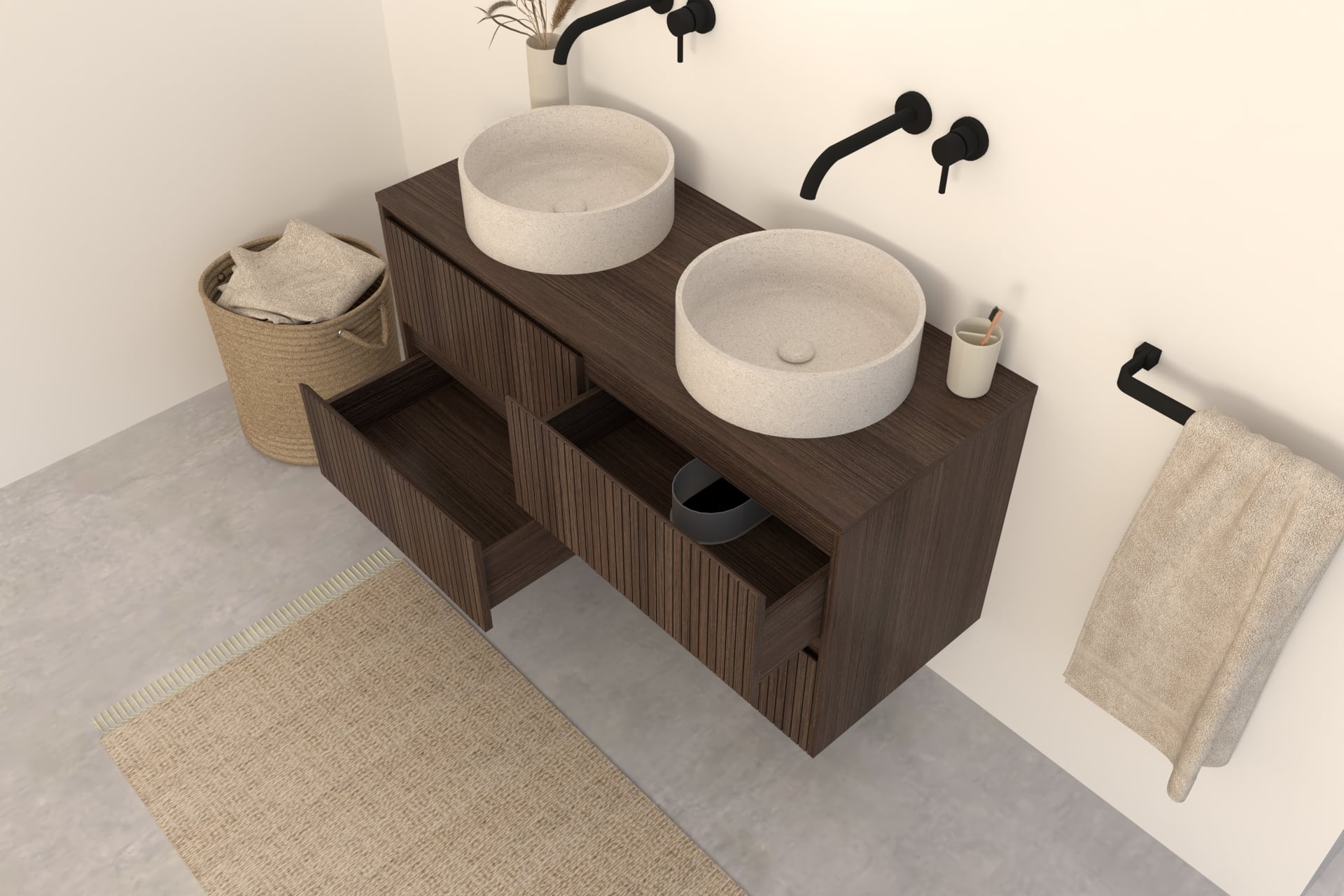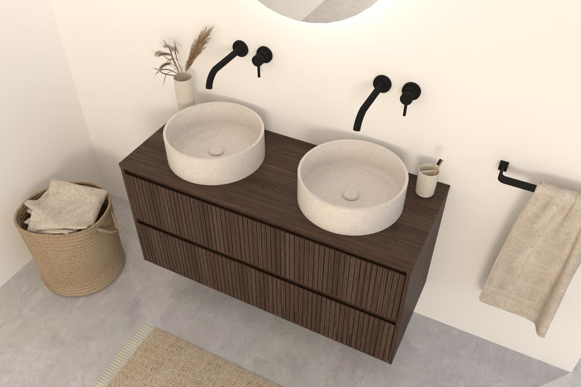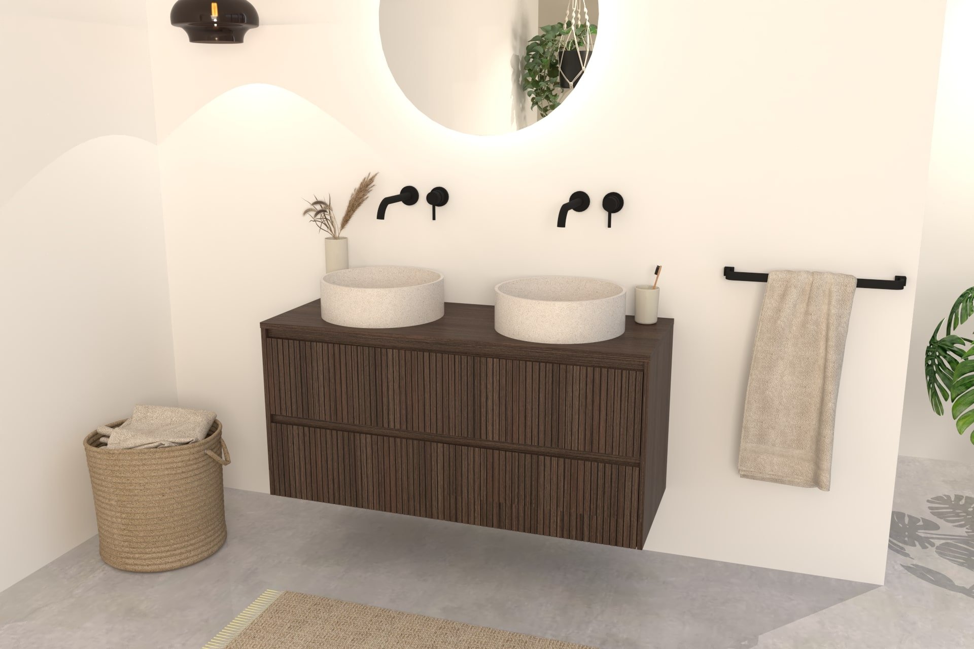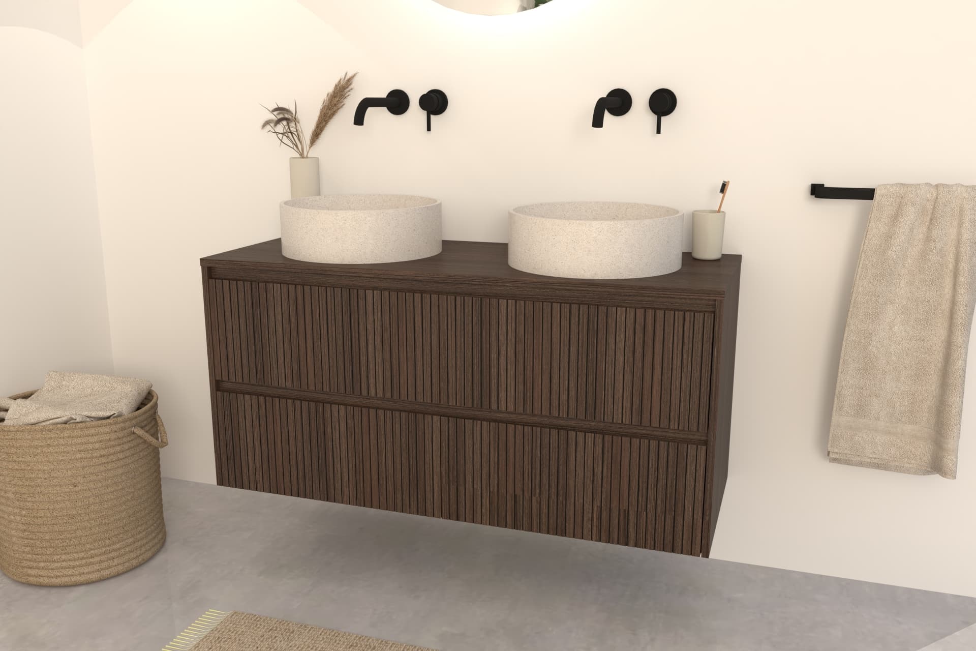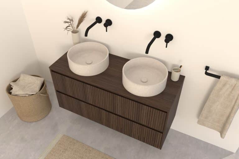 Kombinieren Sie das Nila Badmöbel mit einem passenden Aufsatzwaschbecken aus Naturstein, Terrazzo oder Beton sowie einer stilvollen Waschtischarmatur oder Ablaufgarnitur in z. B. Chrom, Mattschwarz oder Edelstahl.