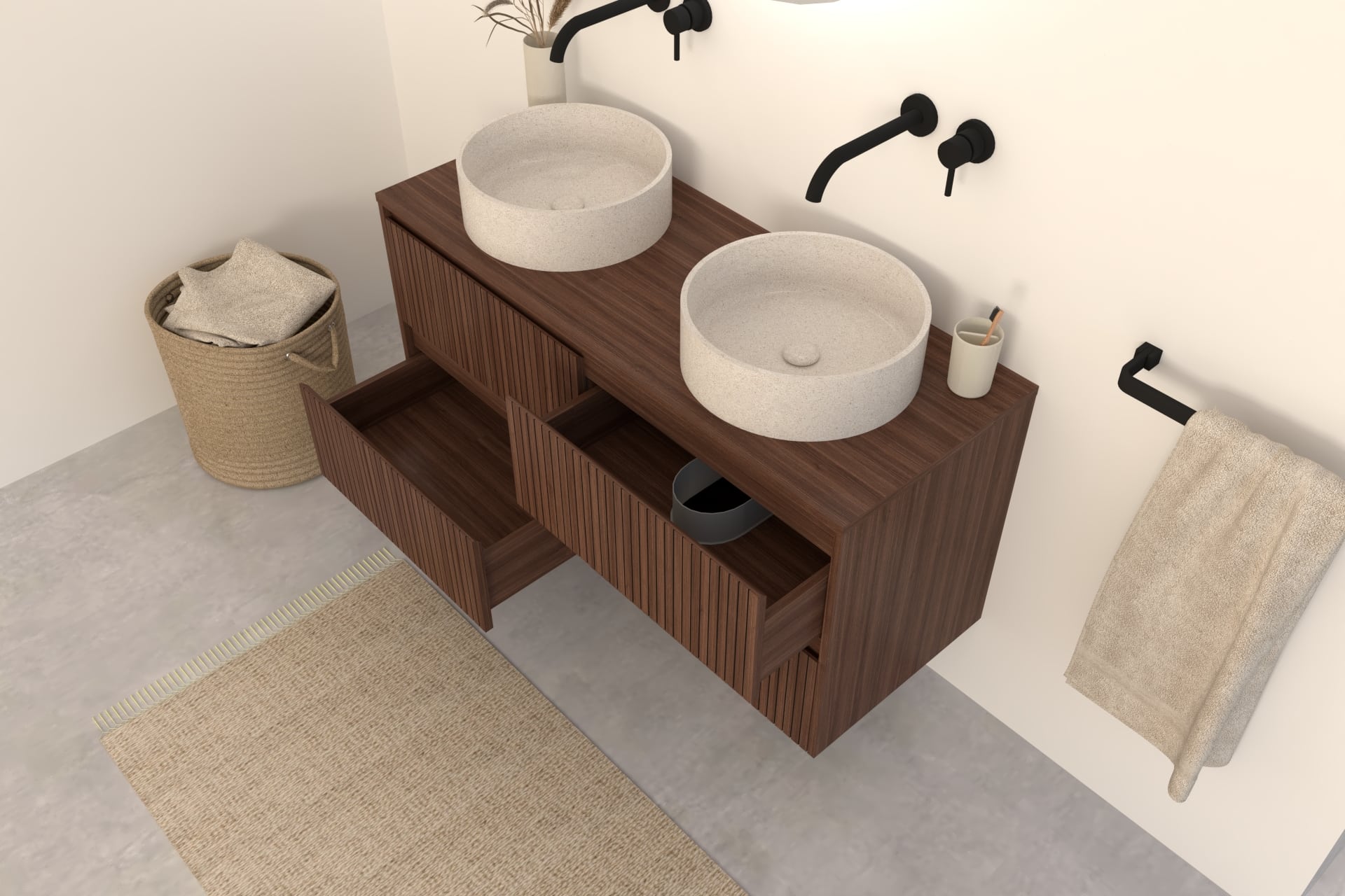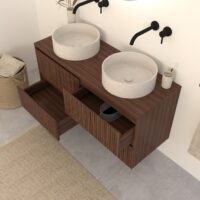 Walnuss-Badmöbel Nila 140 cm – Riffel-Front mit 4 Softclose-Schubladen