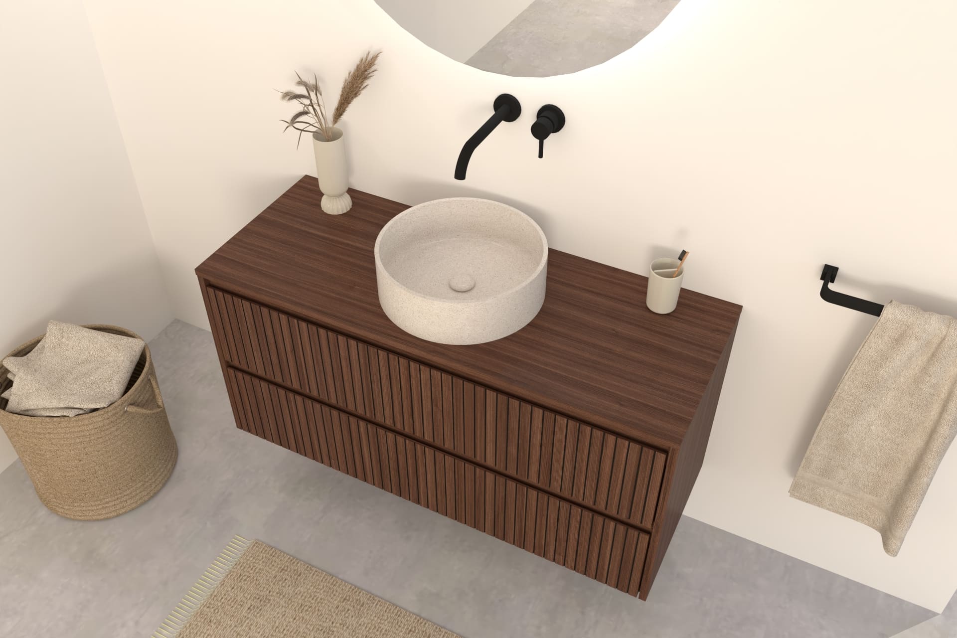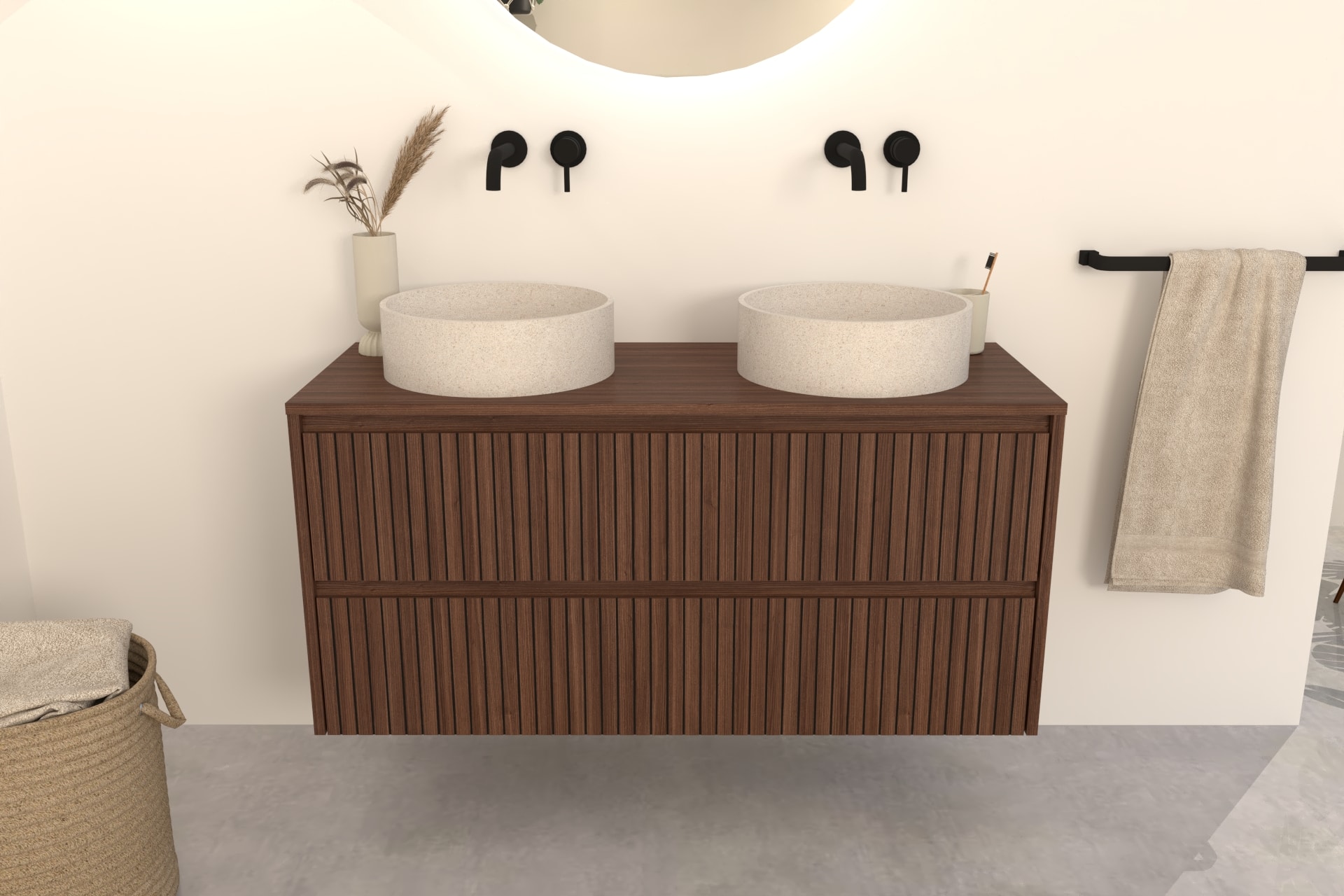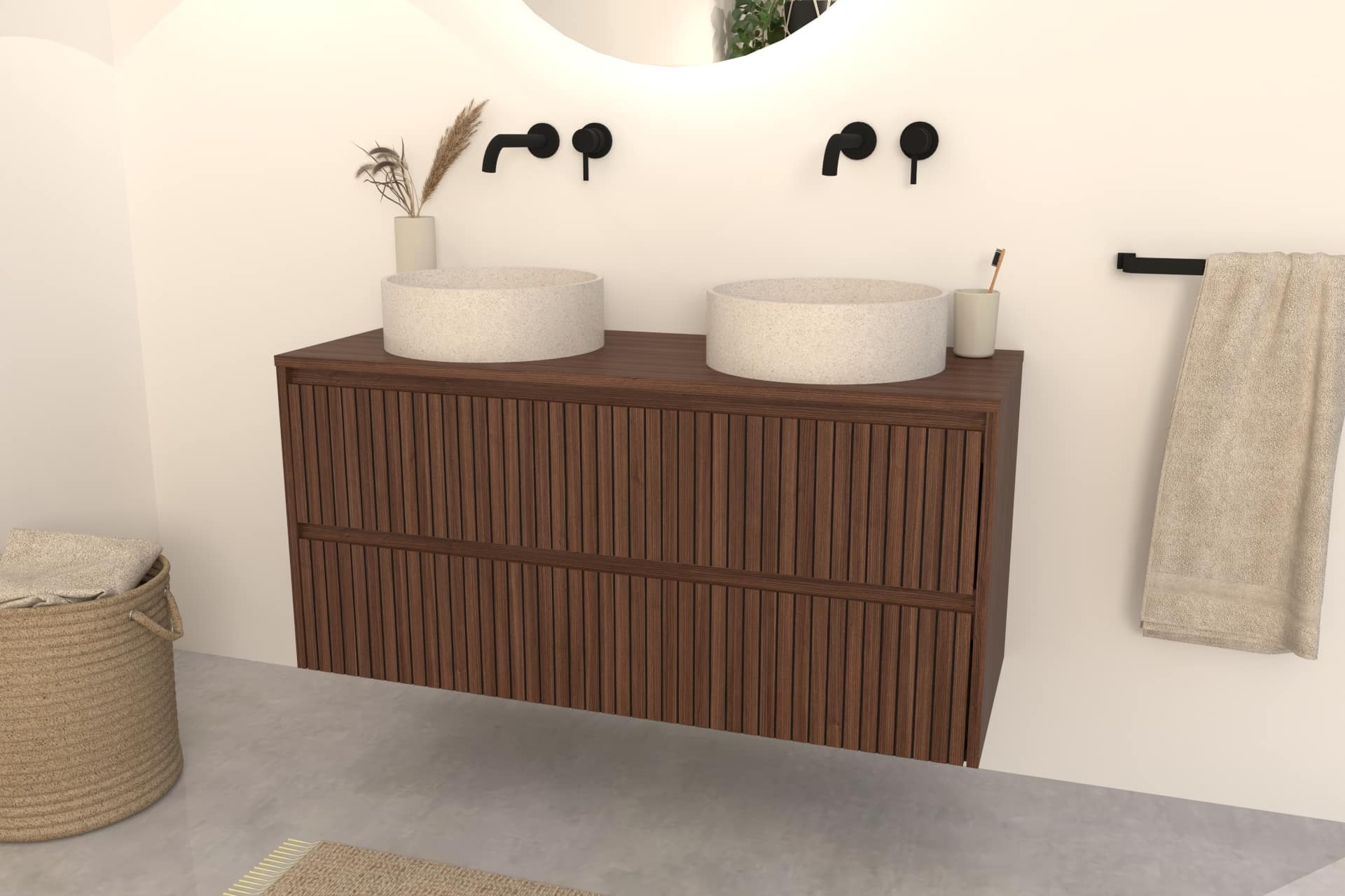 Walnuss-Badmöbel Nila 120 cm – Riffel-Front mit Softclose-Schubladen