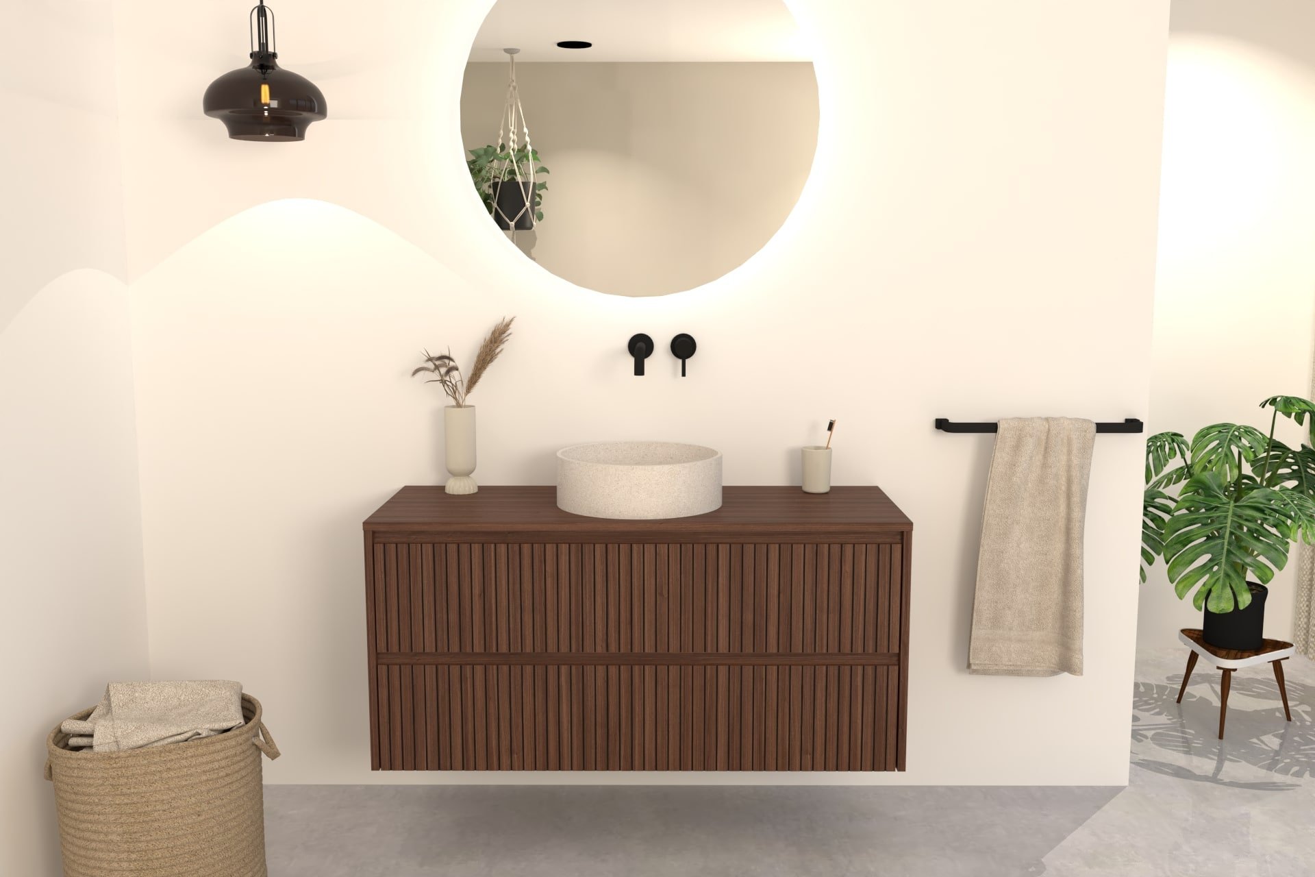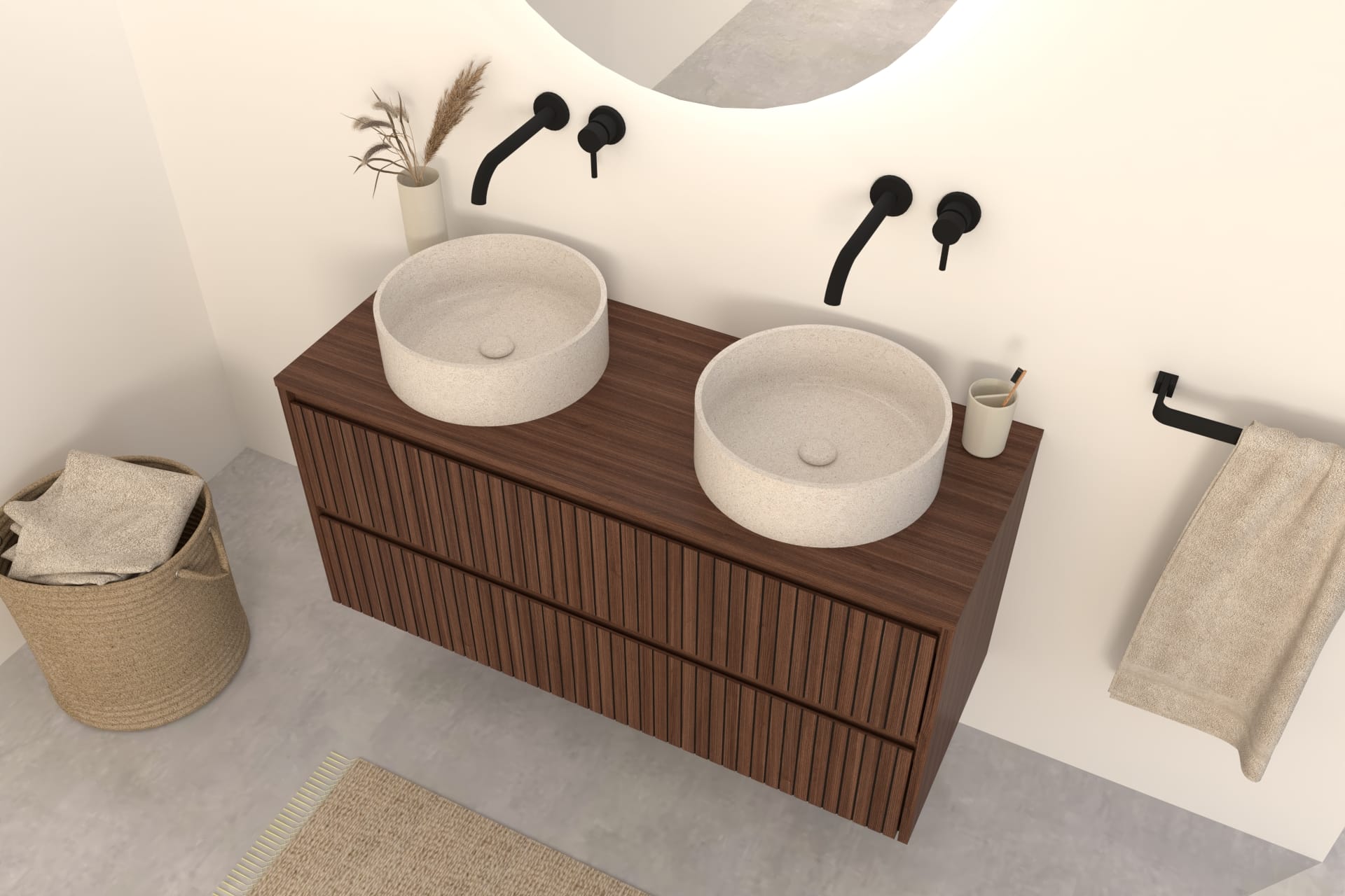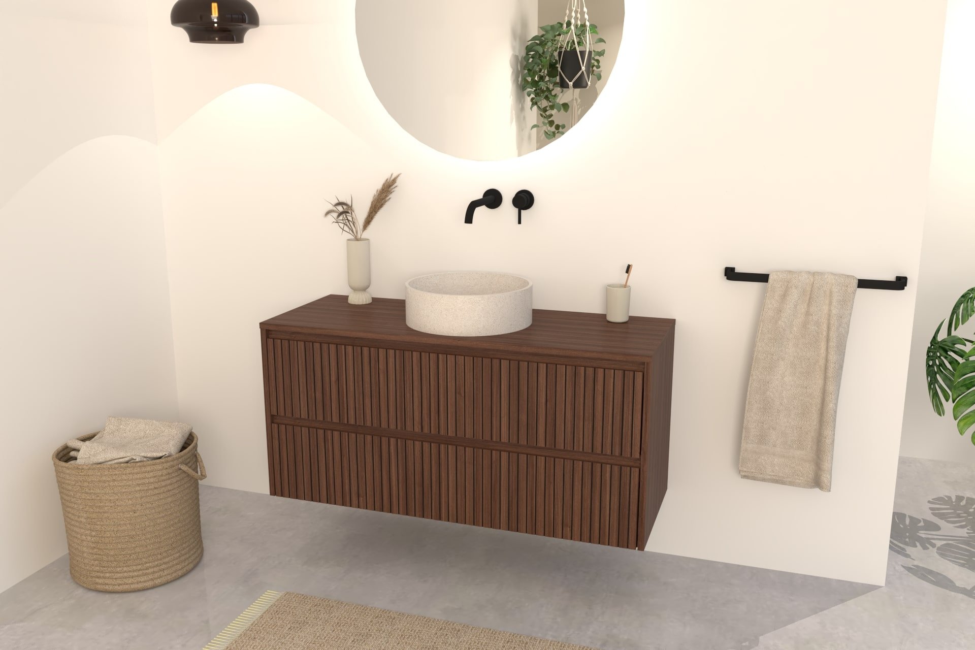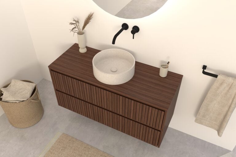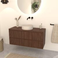Walnuss-Badmöbel Nila 100 cm – Riffel-Front mit Softclose-Schubladen