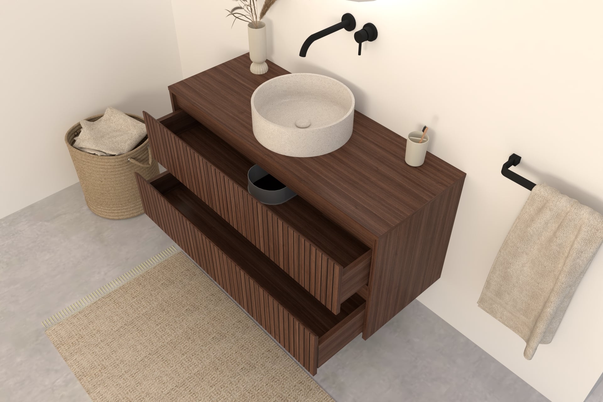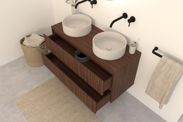 Walnuss-Badmöbel Nila 140 cm – Riffel-Front mit 4 Softclose-Schubladen