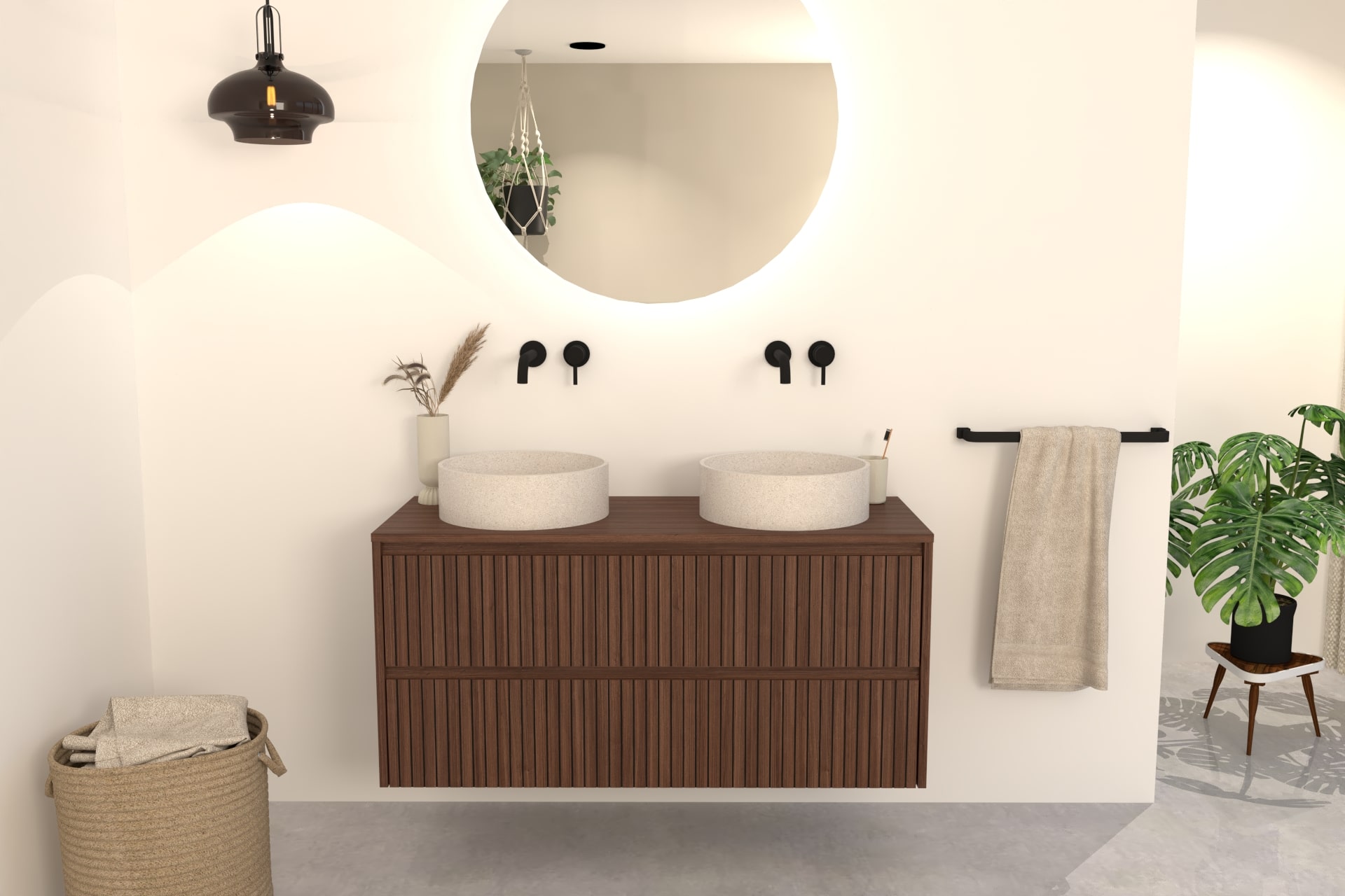 Kombinieren Sie das Nila Badmöbel mit einem passenden Aufsatzwaschbecken aus Naturstein, Terrazzo oder Beton sowie einer stilvollen Waschtischarmatur oder Ablaufgarnitur in z. B. Chrom, Mattschwarz oder Edelstahl.