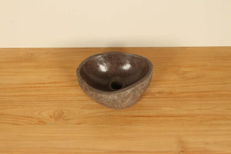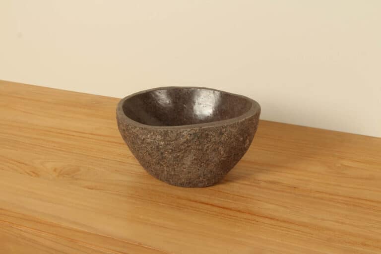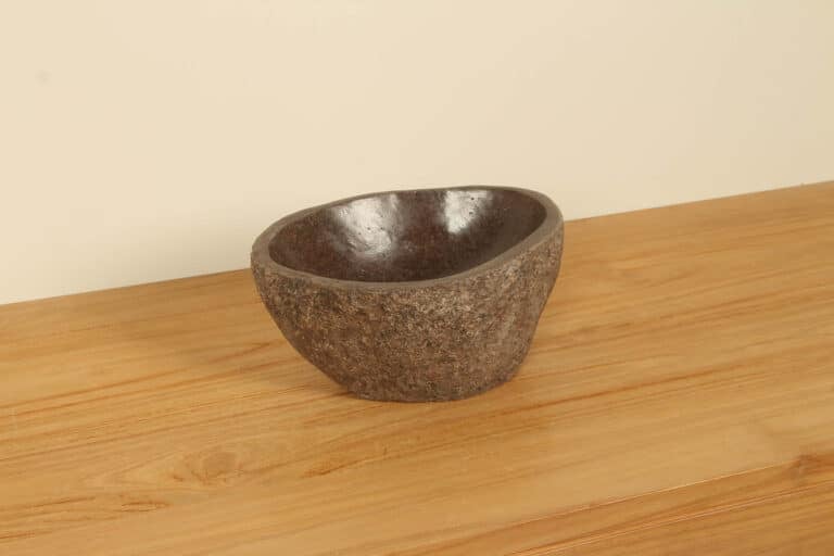 Die kleine Naturstein Waschschale aus Flussstein ist dank ihres kompakten Formats ideal für kleine Räume wie die Toilette oder Gäste-WC. Jede Flussstein-Waschschale wird von Hand aus massivem Naturstein gefertigt. Die Innenseite der Schale ist poliert, während die Außenseite unbehandelt bleibt, wodurch jede Schale stets eine einzigartige, robuste Ausstrahlung erhält.