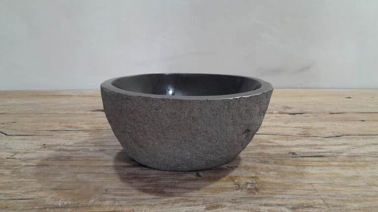 Die kleine Naturstein Waschschale aus Flussstein ist dank ihres kompakten Formats ideal für kleine Räume wie die Toilette oder Gäste-WC. Jede Flussstein-Waschschale wird von Hand aus massivem Naturstein gefertigt. Die Innenseite der Schale ist poliert, während die Außenseite unbehandelt bleibt, wodurch jede Schale stets eine einzigartige, robuste Ausstrahlung erhält.