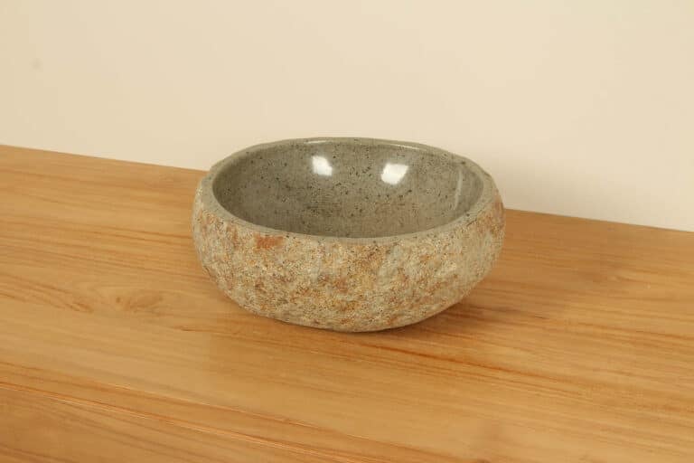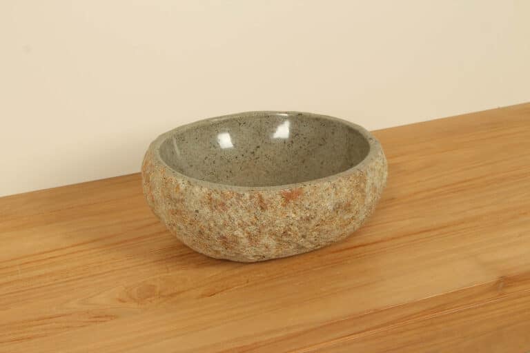 Die kleine Naturstein Waschschale aus Flussstein ist dank ihres kompakten Formats ideal für kleine Räume wie die Toilette oder Gäste-WC. Jede Flussstein-Waschschale wird von Hand aus massivem Naturstein gefertigt. Die Innenseite der Schale ist poliert, während die Außenseite unbehandelt bleibt, wodurch jede Schale stets eine einzigartige, robuste Ausstrahlung erhält.