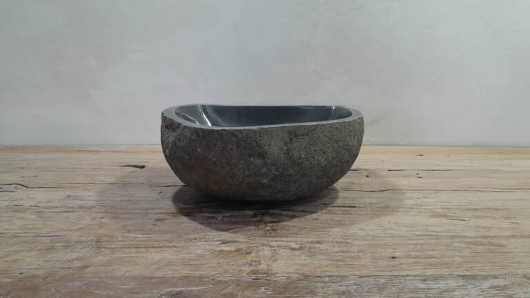 Diese mittelgroße Naturstein Waschschale aus Flussstein ist ideal für kleine bis mittelgroße Badmöbel. Jede Flussstein-Waschschale wird von Hand aus massivem Naturstein gefertigt. Die Innenseite der Schale ist glatt poliert für eine schnelle Wasserableitung und einfache Reinigung, während die Außenseite roh und unbehandelt bleibt, wodurch die Schale ihren robusten und natürlichen Charakter behält.
