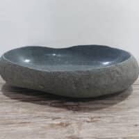 Diese mittelgroße Naturstein Waschschale aus Flussstein ist ideal für kleine bis mittelgroße Badmöbel. Jede Flussstein-Waschschale wird von Hand aus massivem Naturstein gefertigt. Die Innenseite der Schale ist glatt poliert für eine schnelle Wasserableitung und einfache Reinigung, während die Außenseite roh und unbehandelt bleibt, wodurch die Schale ihren robusten und natürlichen Charakter behält.