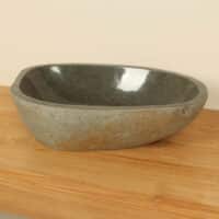 Diese mittelgroße Naturstein Waschschale aus Flussstein ist ideal für kleine bis mittelgroße Badmöbel. Jede Flussstein-Waschschale wird von Hand aus massivem Naturstein gefertigt. Die Innenseite der Schale ist glatt poliert für eine schnelle Wasserableitung und einfache Reinigung, während die Außenseite roh und unbehandelt bleibt, wodurch die Schale ihren robusten und natürlichen Charakter behält.