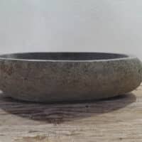 Diese mittelgroße Naturstein Waschschale aus Flussstein ist ideal für kleine bis mittelgroße Badmöbel. Jede Flussstein-Waschschale wird von Hand aus massivem Naturstein gefertigt. Die Innenseite der Schale ist glatt poliert für eine schnelle Wasserableitung und einfache Reinigung, während die Außenseite roh und unbehandelt bleibt, wodurch die Schale ihren robusten und natürlichen Charakter behält.