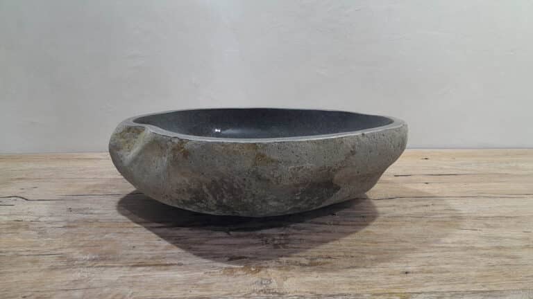 Diese mittelgroße Naturstein Waschschale aus Flussstein ist ideal für kleine bis mittelgroße Badmöbel. Jede Flussstein-Waschschale wird von Hand aus massivem Naturstein gefertigt. Die Innenseite der Schale ist glatt poliert für eine schnelle Wasserableitung und einfache Reinigung, während die Außenseite roh und unbehandelt bleibt, wodurch die Schale ihren robusten und natürlichen Charakter behält.
