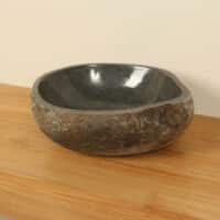 Diese mittelgroße Naturstein Waschschale aus Flussstein ist ideal für kleine bis mittelgroße Badmöbel. Jede Flussstein-Waschschale wird von Hand aus massivem Naturstein gefertigt. Die Innenseite der Schale ist glatt poliert für eine schnelle Wasserableitung und einfache Reinigung, während die Außenseite roh und unbehandelt bleibt, wodurch die Schale ihren robusten und natürlichen Charakter behält.