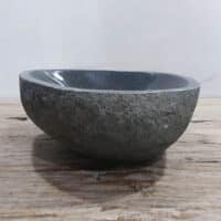 Diese mittelgroße Naturstein Waschschale aus Flussstein ist ideal für kleine bis mittelgroße Badmöbel. Jede Flussstein-Waschschale wird von Hand aus massivem Naturstein gefertigt. Die Innenseite der Schale ist glatt poliert für eine schnelle Wasserableitung und einfache Reinigung, während die Außenseite roh und unbehandelt bleibt, wodurch die Schale ihren robusten und natürlichen Charakter behält.