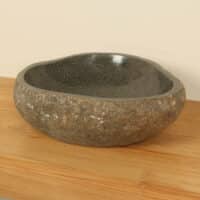 Diese mittelgroße Naturstein Waschschale aus Flussstein ist ideal für kleine bis mittelgroße Badmöbel. Jede Flussstein-Waschschale wird von Hand aus massivem Naturstein gefertigt. Die Innenseite der Schale ist glatt poliert für eine schnelle Wasserableitung und einfache Reinigung, während die Außenseite roh und unbehandelt bleibt, wodurch die Schale ihren robusten und natürlichen Charakter behält.