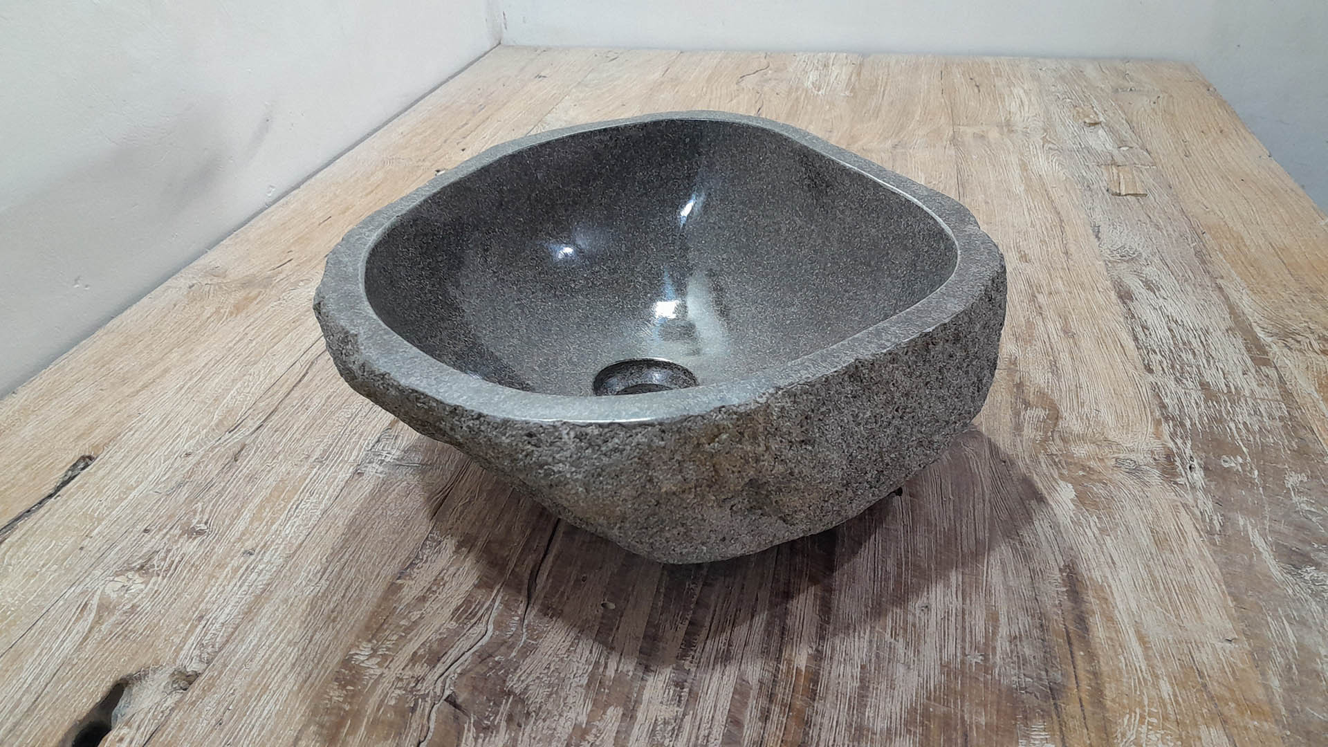 Diese mittelgroße Naturstein Waschschale aus Flussstein ist ideal für kleine bis mittelgroße Badmöbel. Jede Flussstein-Waschschale wird von Hand aus massivem Naturstein gefertigt. Die Innenseite der Schale ist glatt poliert für eine schnelle Wasserableitung und einfache Reinigung, während die Außenseite roh und unbehandelt bleibt, wodurch die Schale ihren robusten und natürlichen Charakter behält.