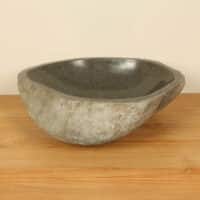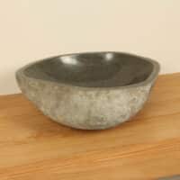 Diese mittelgroße Naturstein Waschschale aus Flussstein ist ideal für kleine bis mittelgroße Badmöbel. Jede Flussstein-Waschschale wird von Hand aus massivem Naturstein gefertigt. Die Innenseite der Schale ist glatt poliert für eine schnelle Wasserableitung und einfache Reinigung, während die Außenseite roh und unbehandelt bleibt, wodurch die Schale ihren robusten und natürlichen Charakter behält.