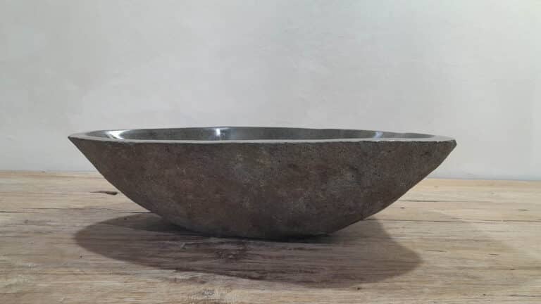 Diese mittelgroße Naturstein Waschschale aus Flussstein ist ideal für kleine bis mittelgroße Badmöbel. Jede Flussstein-Waschschale wird von Hand aus massivem Naturstein gefertigt. Die Innenseite der Schale ist glatt poliert für eine schnelle Wasserableitung und einfache Reinigung, während die Außenseite roh und unbehandelt bleibt, wodurch die Schale ihren robusten und natürlichen Charakter behält.