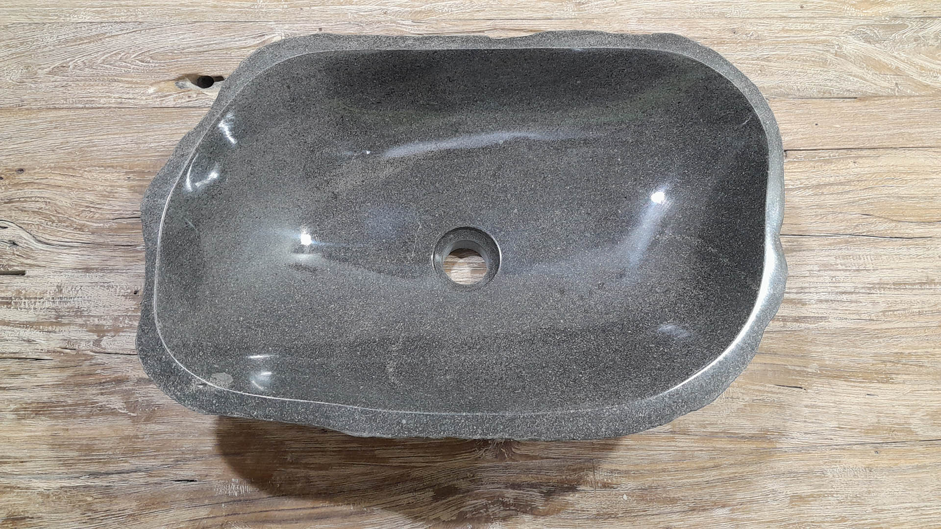 Diese mittelgroße Naturstein Waschschale aus Flussstein ist ideal für kleine bis mittelgroße Badmöbel. Jede Flussstein-Waschschale wird von Hand aus massivem Naturstein gefertigt. Die Innenseite der Schale ist glatt poliert für eine schnelle Wasserableitung und einfache Reinigung, während die Außenseite roh und unbehandelt bleibt, wodurch die Schale ihren robusten und natürlichen Charakter behält.