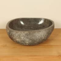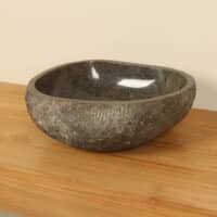 Diese mittelgroße Naturstein Waschschale aus Flussstein ist ideal für kleine bis mittelgroße Badmöbel. Jede Flussstein-Waschschale wird von Hand aus massivem Naturstein gefertigt. Die Innenseite der Schale ist glatt poliert für eine schnelle Wasserableitung und einfache Reinigung, während die Außenseite roh und unbehandelt bleibt, wodurch die Schale ihren robusten und natürlichen Charakter behält.