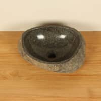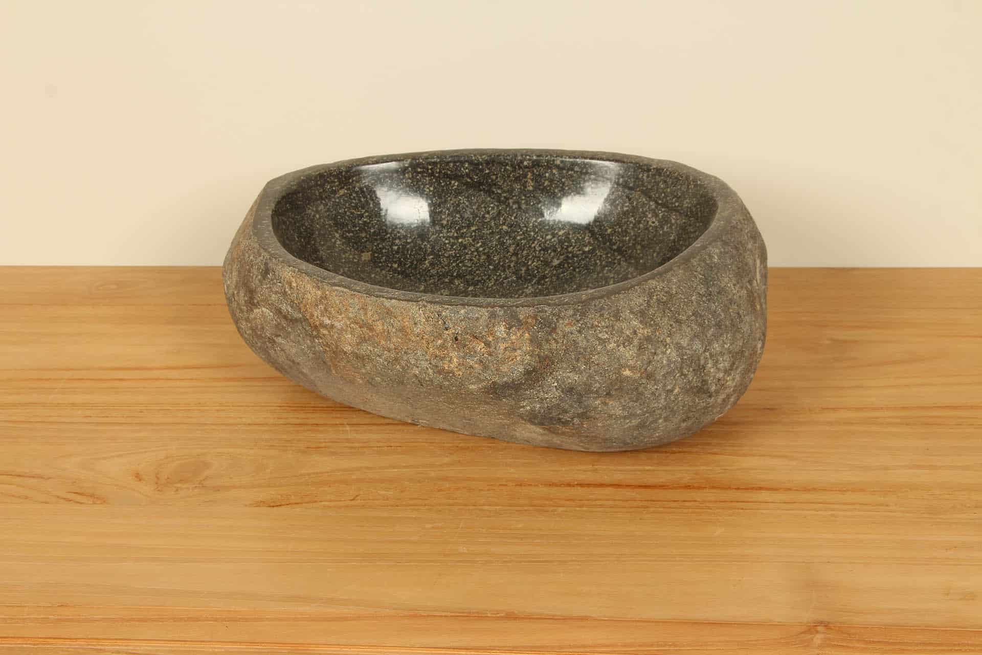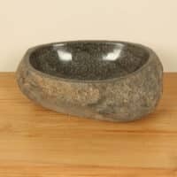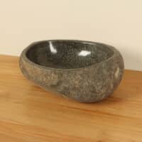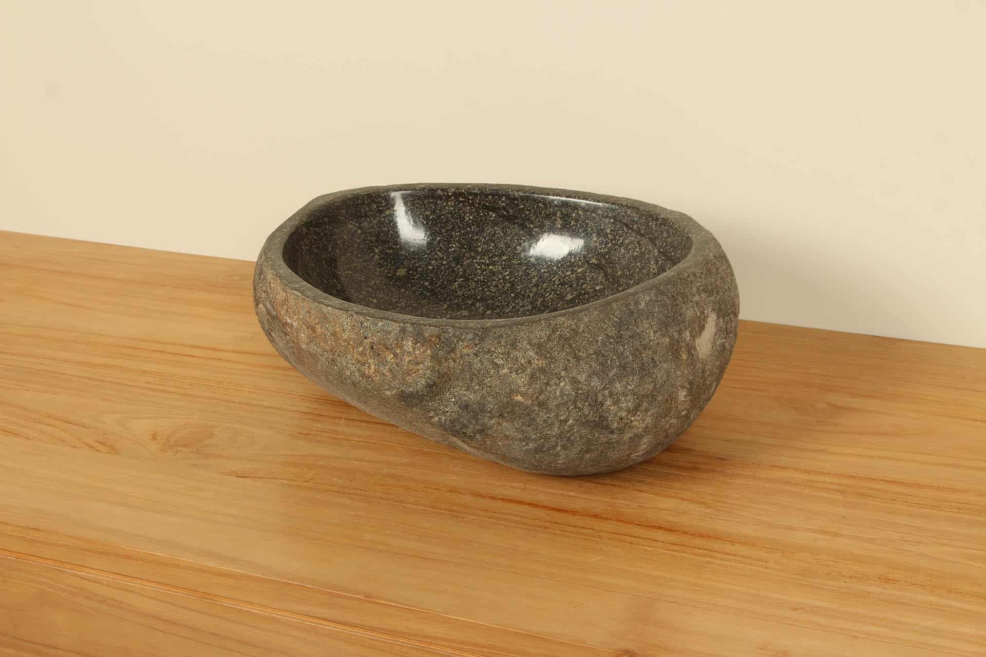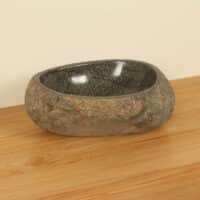 Diese mittelgroße Naturstein Waschschale aus Flussstein ist ideal für kleine bis mittelgroße Badmöbel. Jede Flussstein-Waschschale wird von Hand aus massivem Naturstein gefertigt. Die Innenseite der Schale ist glatt poliert für eine schnelle Wasserableitung und einfache Reinigung, während die Außenseite roh und unbehandelt bleibt, wodurch die Schale ihren robusten und natürlichen Charakter behält.