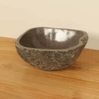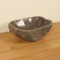 Diese mittelgroße Naturstein Waschschale aus Flussstein ist ideal für kleine bis mittelgroße Badmöbel. Jede Flussstein-Waschschale wird von Hand aus massivem Naturstein gefertigt. Die Innenseite der Schale ist glatt poliert für eine schnelle Wasserableitung und einfache Reinigung, während die Außenseite roh und unbehandelt bleibt, wodurch die Schale ihren robusten und natürlichen Charakter behält.