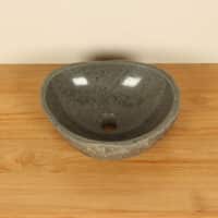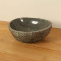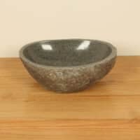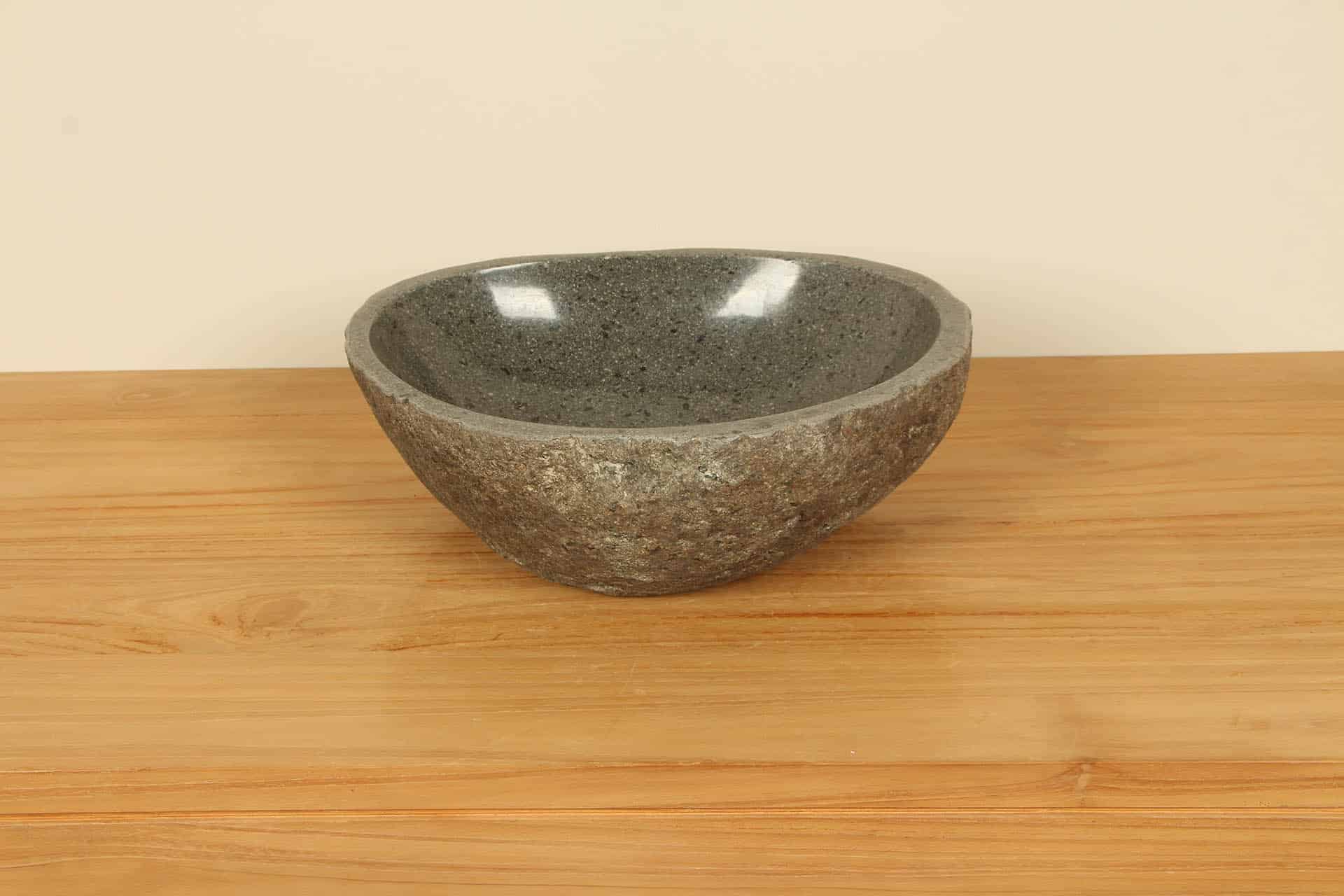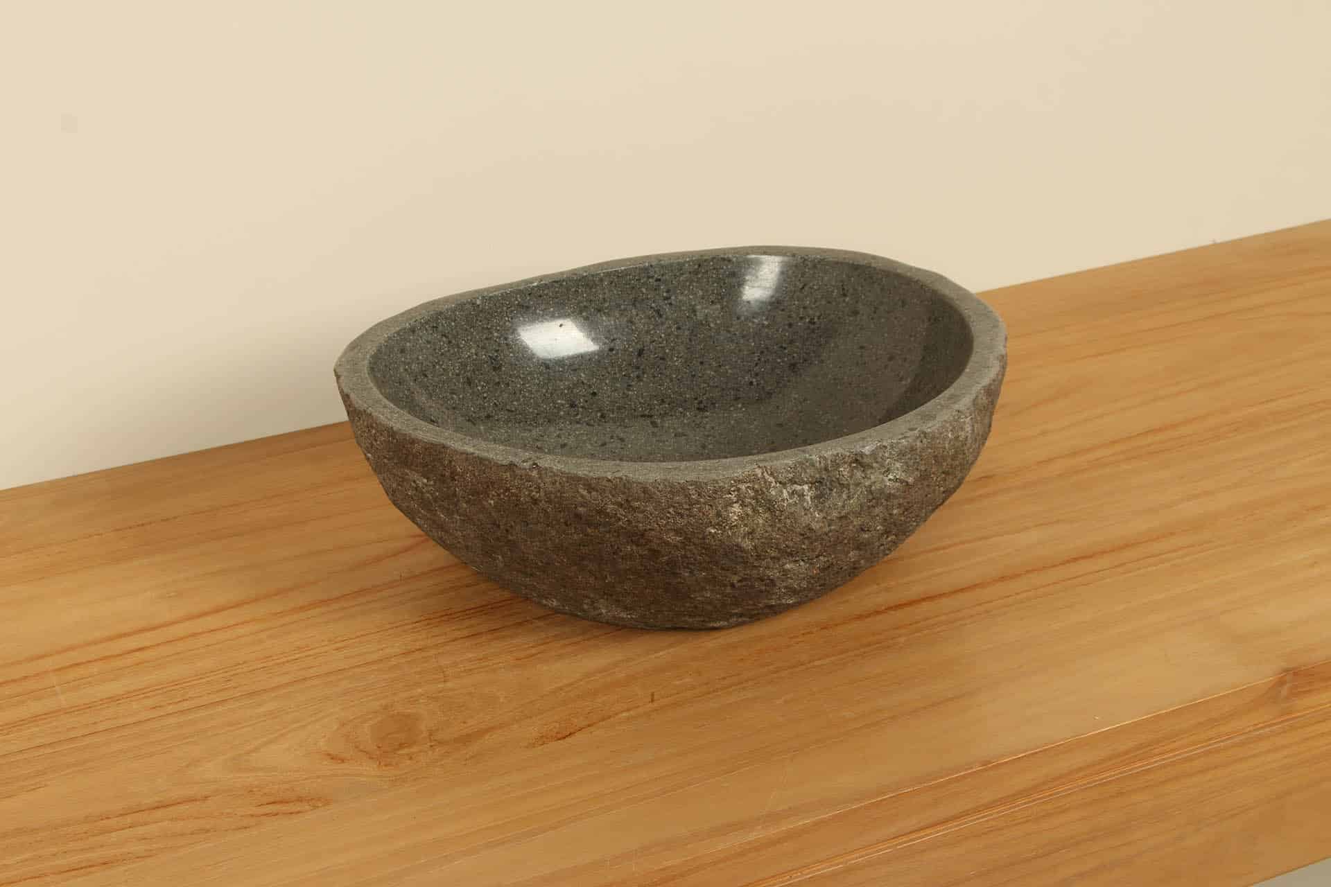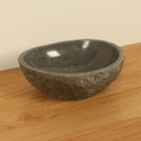 Diese mittelgroße Naturstein Waschschale aus Flussstein ist ideal für kleine bis mittelgroße Badmöbel. Jede Flussstein-Waschschale wird von Hand aus massivem Naturstein gefertigt. Die Innenseite der Schale ist glatt poliert für eine schnelle Wasserableitung und einfache Reinigung, während die Außenseite roh und unbehandelt bleibt, wodurch die Schale ihren robusten und natürlichen Charakter behält.