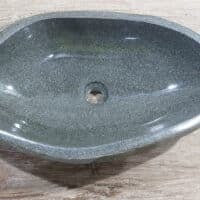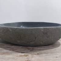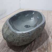 Diese mittelgroße Naturstein Waschschale aus Flussstein ist ideal für kleine bis mittelgroße Badmöbel. Jede Flussstein-Waschschale wird von Hand aus massivem Naturstein gefertigt. Die Innenseite der Schale ist glatt poliert für eine schnelle Wasserableitung und einfache Reinigung, während die Außenseite roh und unbehandelt bleibt, wodurch die Schale ihren robusten und natürlichen Charakter behält.