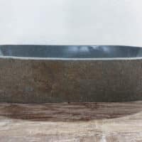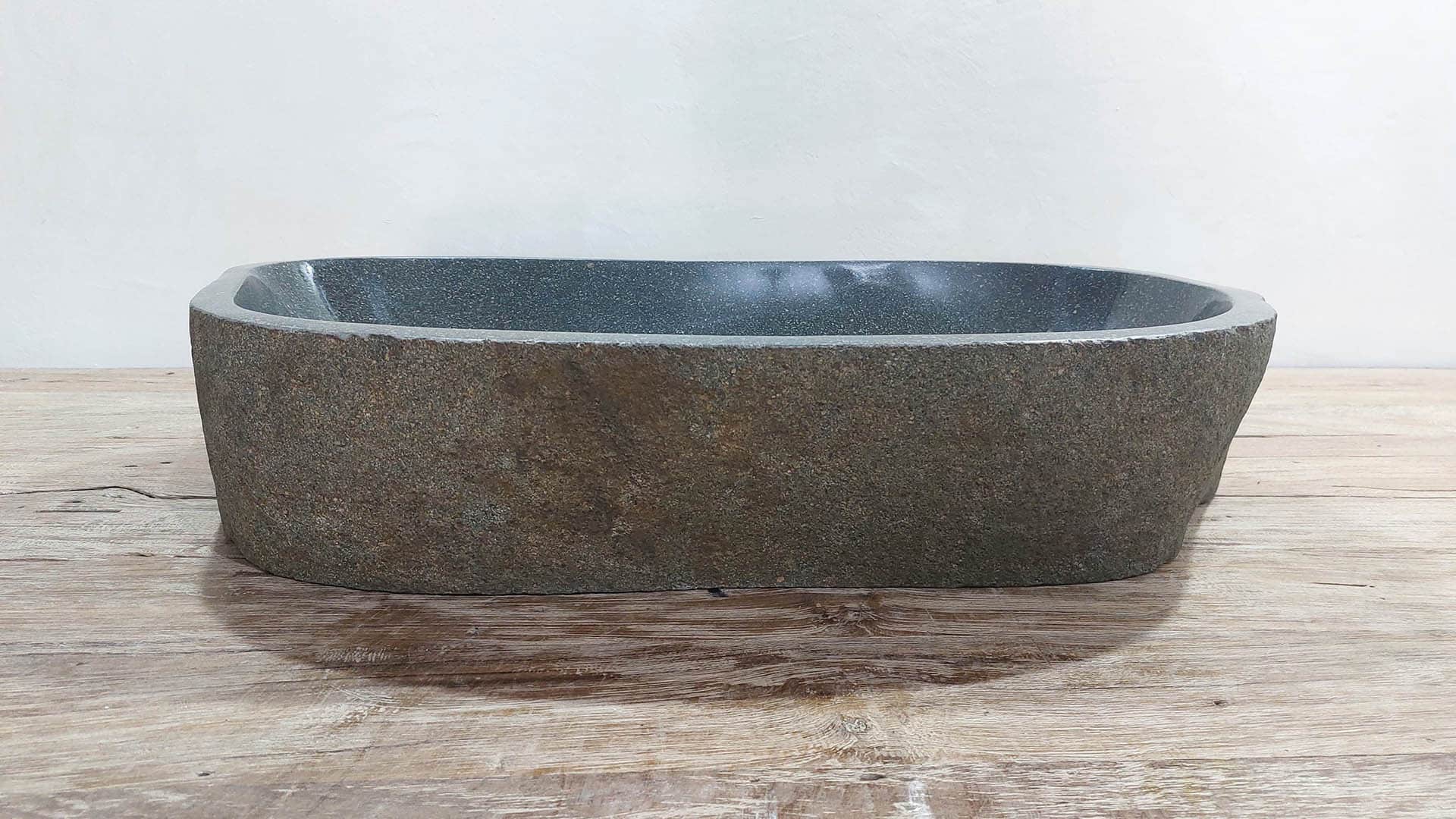 Diese mittelgroße Naturstein Waschschale aus Flussstein ist ideal für kleine bis mittelgroße Badmöbel. Jede Flussstein-Waschschale wird von Hand aus massivem Naturstein gefertigt. Die Innenseite der Schale ist glatt poliert für eine schnelle Wasserableitung und einfache Reinigung, während die Außenseite roh und unbehandelt bleibt, wodurch die Schale ihren robusten und natürlichen Charakter behält.