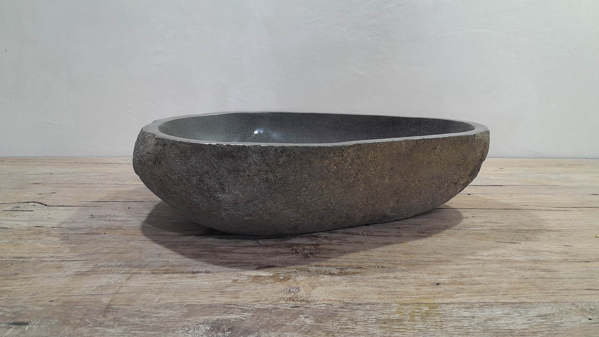 Diese mittelgroße Naturstein Waschschale aus Flussstein ist ideal für kleine bis mittelgroße Badmöbel. Jede Flussstein-Waschschale wird von Hand aus massivem Naturstein gefertigt. Die Innenseite der Schale ist glatt poliert für eine schnelle Wasserableitung und einfache Reinigung, während die Außenseite roh und unbehandelt bleibt, wodurch die Schale ihren robusten und natürlichen Charakter behält.