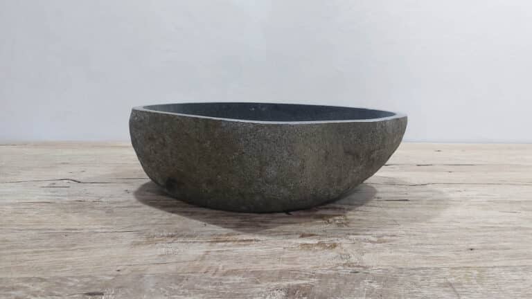 Diese mittelgroße Naturstein Waschschale aus Flussstein ist ideal für kleine bis mittelgroße Badmöbel. Jede Flussstein-Waschschale wird von Hand aus massivem Naturstein gefertigt. Die Innenseite der Schale ist glatt poliert für eine schnelle Wasserableitung und einfache Reinigung, während die Außenseite roh und unbehandelt bleibt, wodurch die Schale ihren robusten und natürlichen Charakter behält.