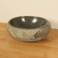 Diese mittelgroße Naturstein Waschschale aus Flussstein ist ideal für kleine bis mittelgroße Badmöbel. Jede Flussstein-Waschschale wird von Hand aus massivem Naturstein gefertigt. Die Innenseite der Schale ist glatt poliert für eine schnelle Wasserableitung und einfache Reinigung, während die Außenseite roh und unbehandelt bleibt, wodurch die Schale ihren robusten und natürlichen Charakter behält.