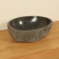 Diese mittelgroße Naturstein Waschschale aus Flussstein ist ideal für kleine bis mittelgroße Badmöbel. Jede Flussstein-Waschschale wird von Hand aus massivem Naturstein gefertigt. Die Innenseite der Schale ist glatt poliert für eine schnelle Wasserableitung und einfache Reinigung, während die Außenseite roh und unbehandelt bleibt, wodurch die Schale ihren robusten und natürlichen Charakter behält.