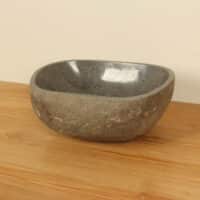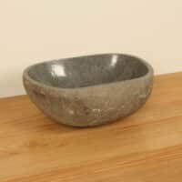 Diese mittelgroße Naturstein Waschschale aus Flussstein ist ideal für kleine bis mittelgroße Badmöbel. Jede Flussstein-Waschschale wird von Hand aus massivem Naturstein gefertigt. Die Innenseite der Schale ist glatt poliert für eine schnelle Wasserableitung und einfache Reinigung, während die Außenseite roh und unbehandelt bleibt, wodurch die Schale ihren robusten und natürlichen Charakter behält.