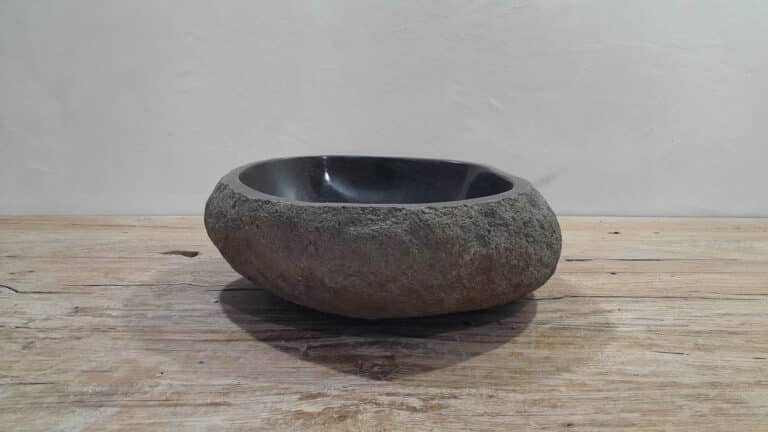 Diese mittelgroße Naturstein Waschschale aus Flussstein ist ideal für kleine bis mittelgroße Badmöbel. Jede Flussstein-Waschschale wird von Hand aus massivem Naturstein gefertigt. Die Innenseite der Schale ist glatt poliert für eine schnelle Wasserableitung und einfache Reinigung, während die Außenseite roh und unbehandelt bleibt, wodurch die Schale ihren robusten und natürlichen Charakter behält.