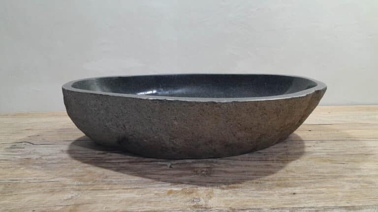 Diese mittelgroße Naturstein Waschschale aus Flussstein ist ideal für kleine bis mittelgroße Badmöbel. Jede Flussstein-Waschschale wird von Hand aus massivem Naturstein gefertigt. Die Innenseite der Schale ist glatt poliert für eine schnelle Wasserableitung und einfache Reinigung, während die Außenseite roh und unbehandelt bleibt, wodurch die Schale ihren robusten und natürlichen Charakter behält.