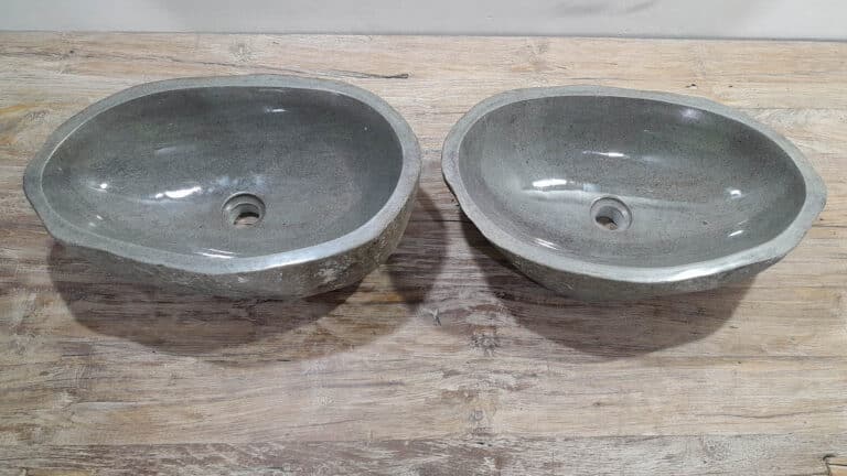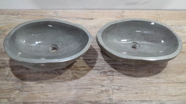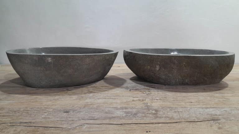 Mit diesem Flussstein Waschbecken Set holen Sie sich ein besonderes Naturprodukt in Ihr Zuhause. Das Set besteht aus zwei handgefertigten Becken, gefertigt aus einem einzigen Flussstein. So stimmen Farbe, Größe und Maserung perfekt überein, während beide Becken ihre eigene natürliche Variation behalten. Ideal für Ihren Doppelwaschtisch. Jedes Set wird vollständig von Hand aus massivem Naturstein hergestellt. Die Innenseite ist glatt poliert für optimale Wasserableitung und einfache Reinigung, während die Außenseite roh bleibt und den robusten, natürlichen Charakter bewahrt.