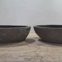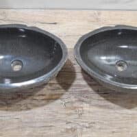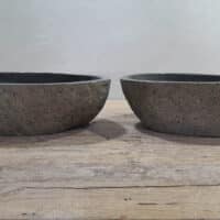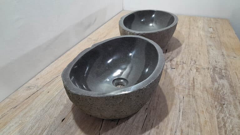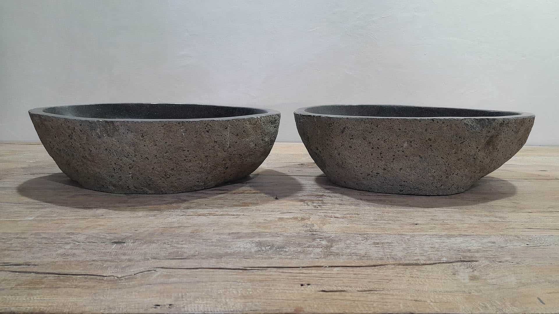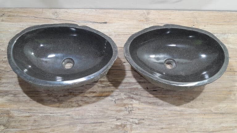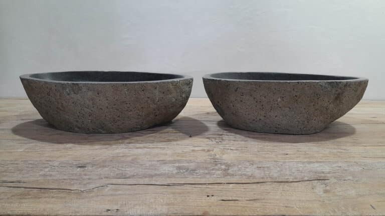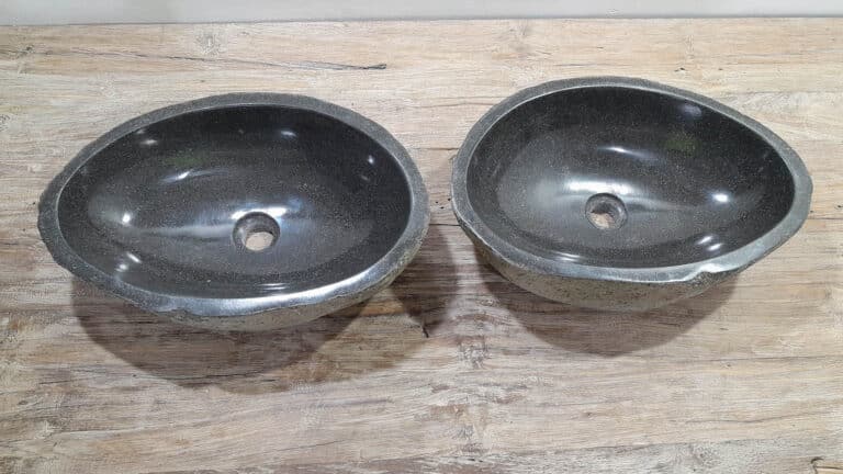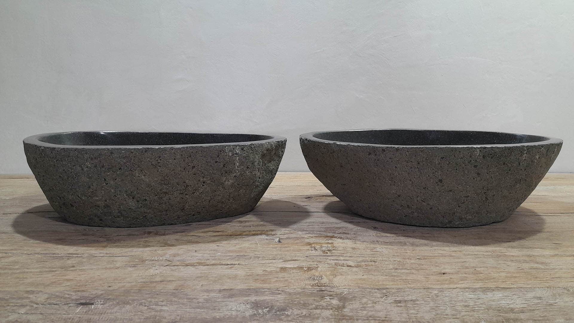 Mit diesem Flussstein Waschbecken Set holen Sie sich ein besonderes Naturprodukt in Ihr Zuhause. Das Set besteht aus zwei handgefertigten Becken, gefertigt aus einem einzigen Flussstein. So stimmen Farbe, Größe und Maserung perfekt überein, während beide Becken ihre eigene natürliche Variation behalten. Ideal für Ihren Doppelwaschtisch. Jedes Set wird vollständig von Hand aus massivem Naturstein hergestellt. Die Innenseite ist glatt poliert für optimale Wasserableitung und einfache Reinigung, während die Außenseite roh bleibt und den robusten, natürlichen Charakter bewahrt.