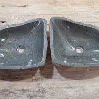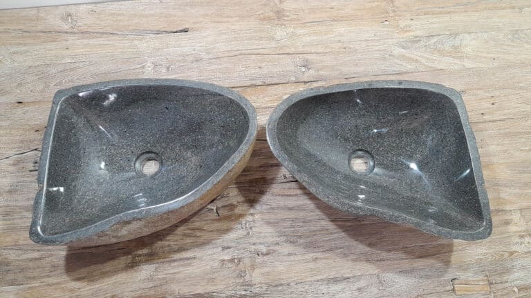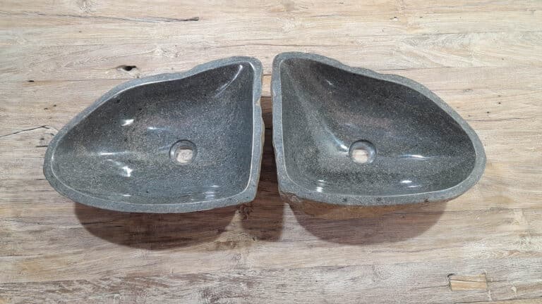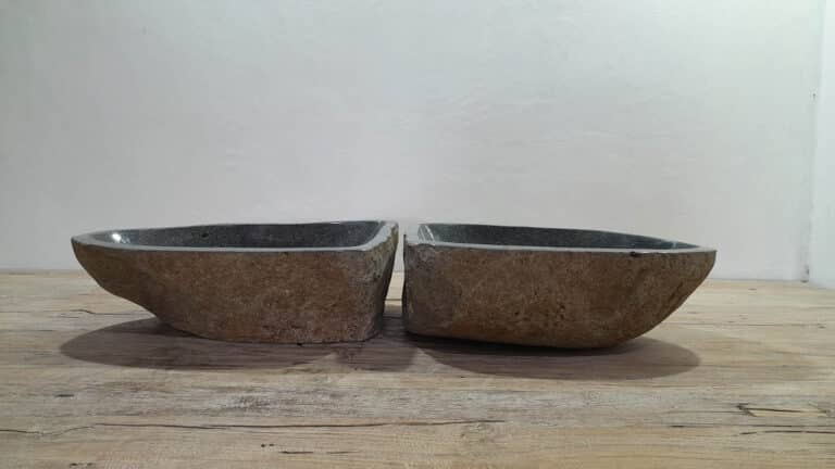 Mit diesem Flussstein Waschbecken Set holen Sie sich ein besonderes Naturprodukt in Ihr Zuhause. Das Set besteht aus zwei handgefertigten Becken, gefertigt aus einem einzigen Flussstein. So stimmen Farbe, Größe und Maserung perfekt überein, während beide Becken ihre eigene natürliche Variation behalten. Ideal für Ihren Doppelwaschtisch. Jedes Set wird vollständig von Hand aus massivem Naturstein hergestellt. Die Innenseite ist glatt poliert für optimale Wasserableitung und einfache Reinigung, während die Außenseite roh bleibt und den robusten, natürlichen Charakter bewahrt.