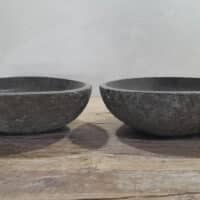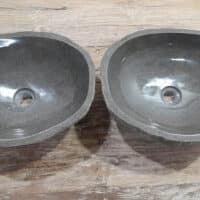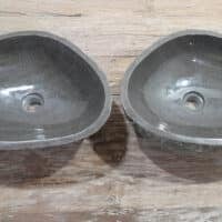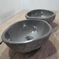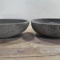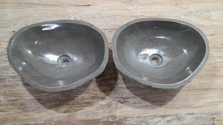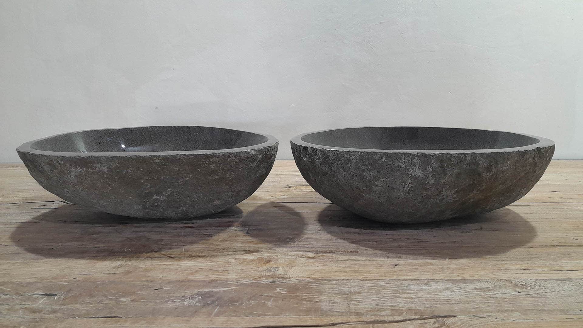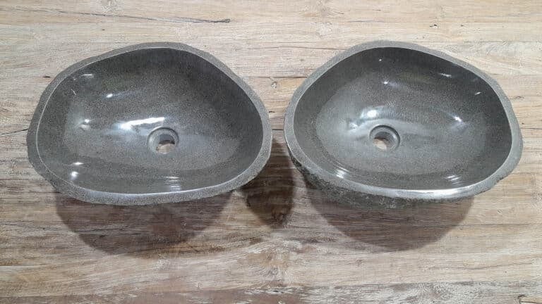 Mit diesem Flussstein Waschbecken Set holen Sie sich ein besonderes Naturprodukt in Ihr Zuhause. Das Set besteht aus zwei handgefertigten Becken, gefertigt aus einem einzigen Flussstein. So stimmen Farbe, Größe und Maserung perfekt überein, während beide Becken ihre eigene natürliche Variation behalten. Ideal für Ihren Doppelwaschtisch. Jedes Set wird vollständig von Hand aus massivem Naturstein hergestellt. Die Innenseite ist glatt poliert für optimale Wasserableitung und einfache Reinigung, während die Außenseite roh bleibt und den robusten, natürlichen Charakter bewahrt.