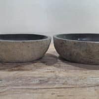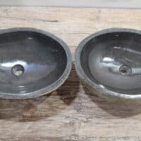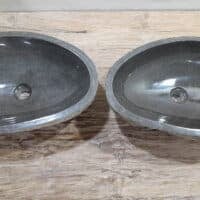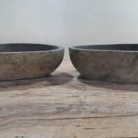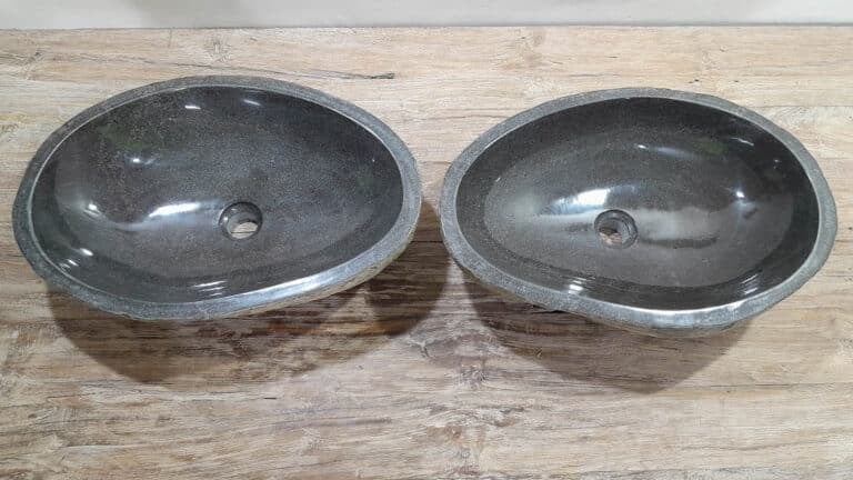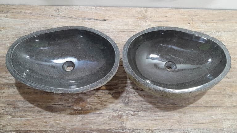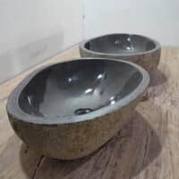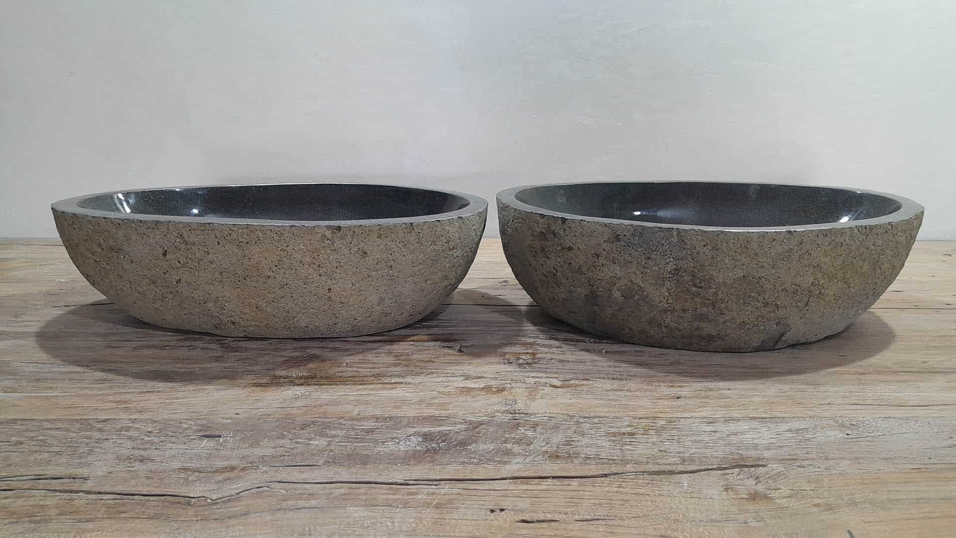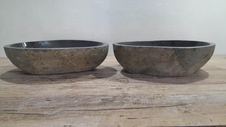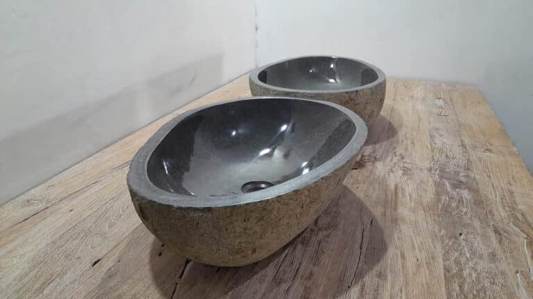 Mit diesem Flussstein Waschbecken Set holen Sie sich ein besonderes Naturprodukt in Ihr Zuhause. Das Set besteht aus zwei handgefertigten Becken, gefertigt aus einem einzigen Flussstein. So stimmen Farbe, Größe und Maserung perfekt überein, während beide Becken ihre eigene natürliche Variation behalten. Ideal für Ihren Doppelwaschtisch. Jedes Set wird vollständig von Hand aus massivem Naturstein hergestellt. Die Innenseite ist glatt poliert für optimale Wasserableitung und einfache Reinigung, während die Außenseite roh bleibt und den robusten, natürlichen Charakter bewahrt.
