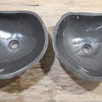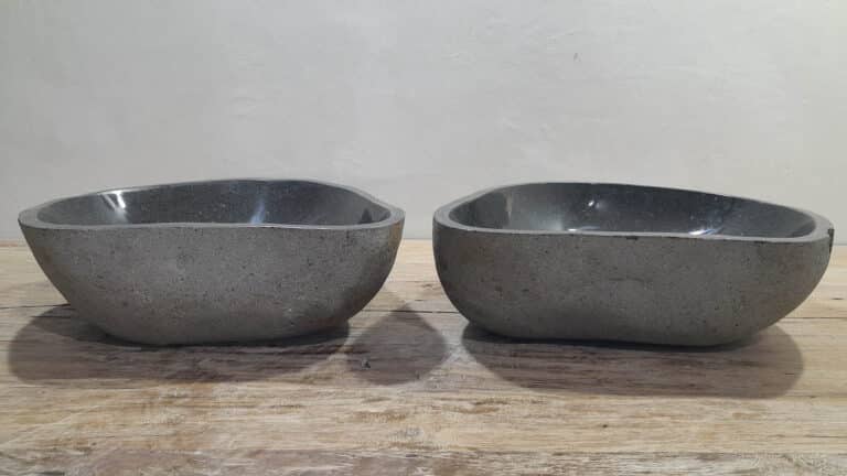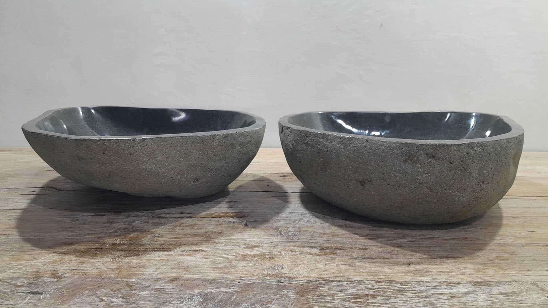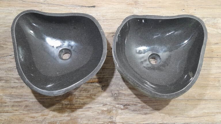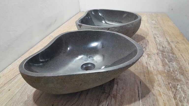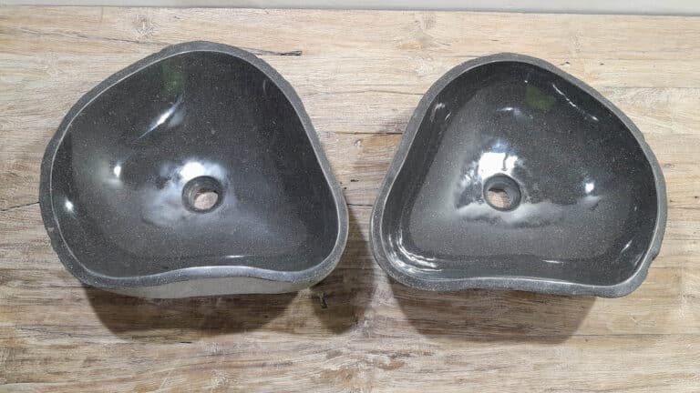 Mit diesem Flussstein Waschbecken Set holen Sie sich ein besonderes Naturprodukt in Ihr Zuhause. Das Set besteht aus zwei handgefertigten Becken, gefertigt aus einem einzigen Flussstein. So stimmen Farbe, Größe und Maserung perfekt überein, während beide Becken ihre eigene natürliche Variation behalten. Ideal für Ihren Doppelwaschtisch. Jedes Set wird vollständig von Hand aus massivem Naturstein hergestellt. Die Innenseite ist glatt poliert für optimale Wasserableitung und einfache Reinigung, während die Außenseite roh bleibt und den robusten, natürlichen Charakter bewahrt.
