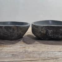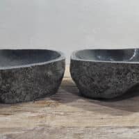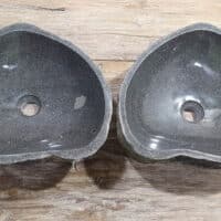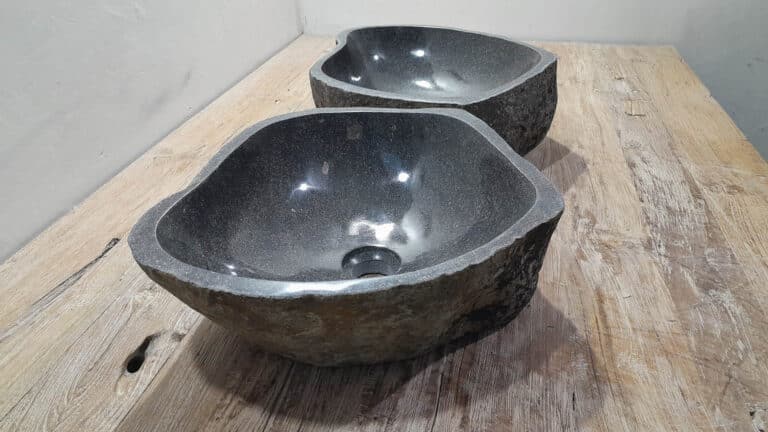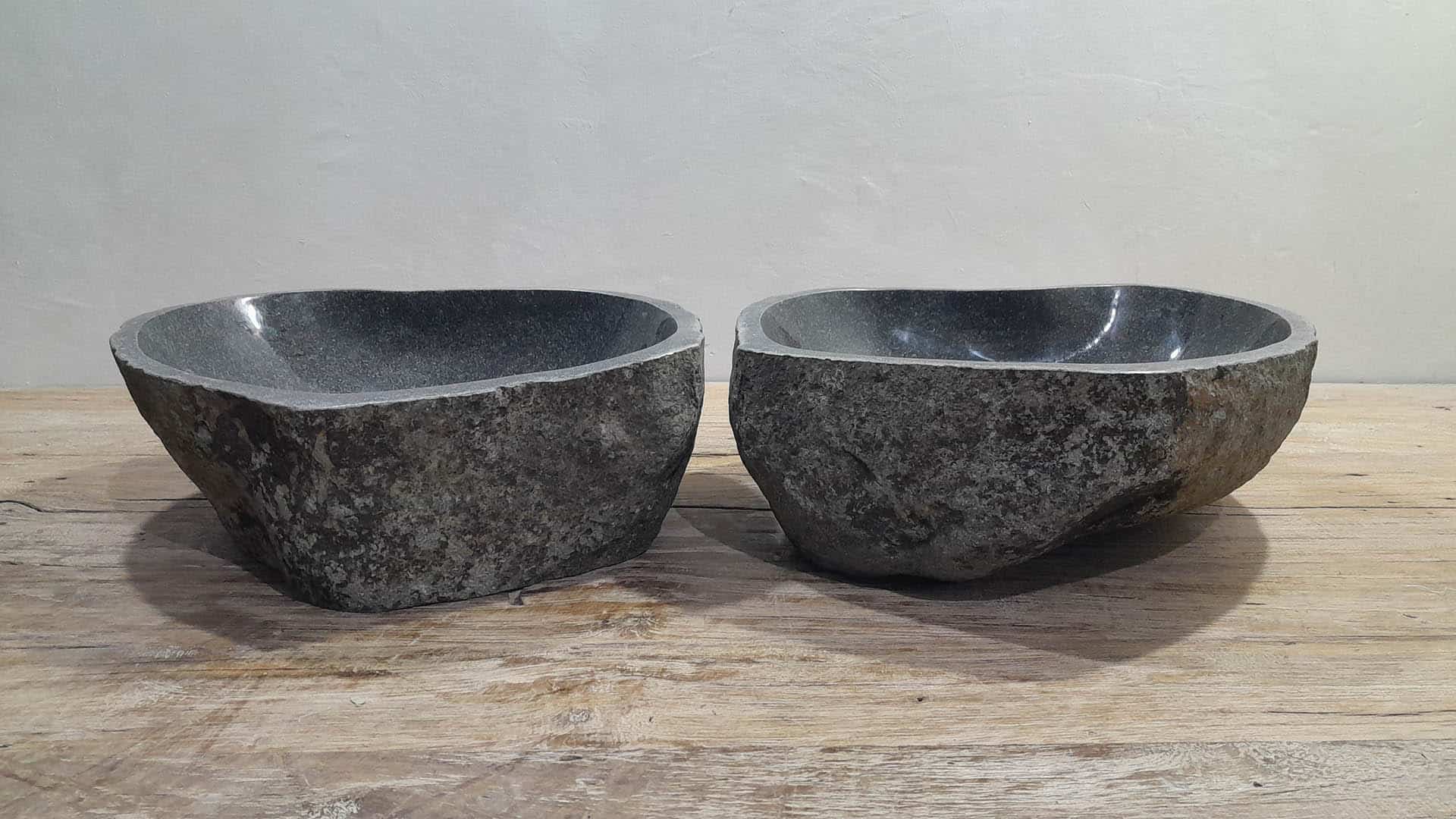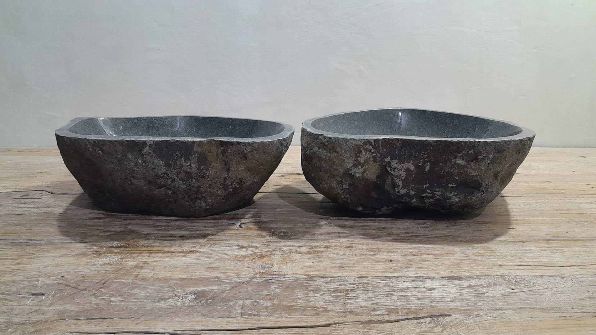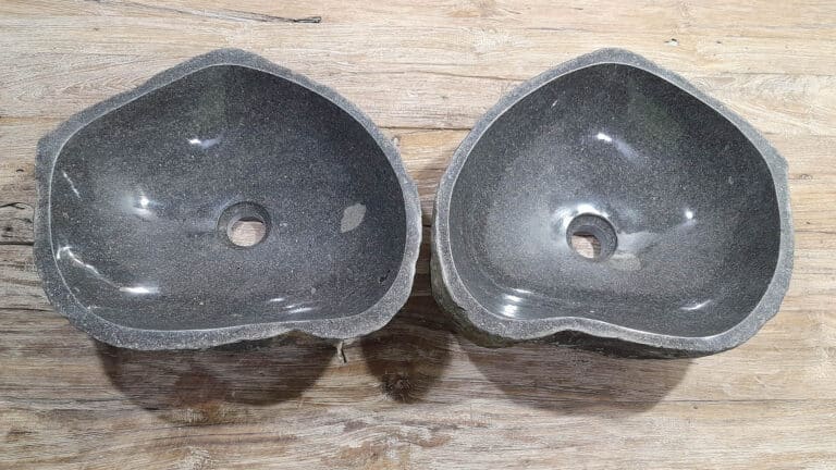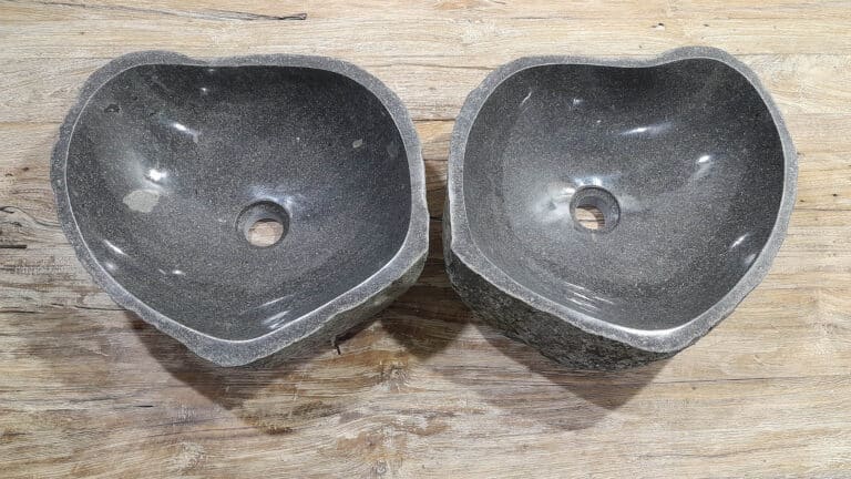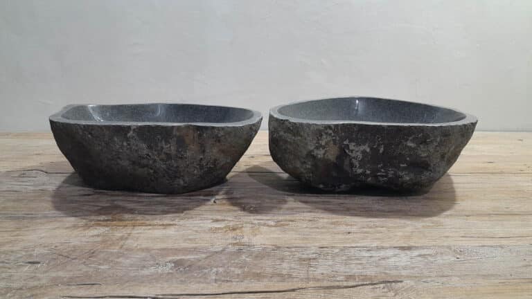 Mit diesem Flussstein Waschbecken Set holen Sie sich ein besonderes Naturprodukt in Ihr Zuhause. Das Set besteht aus zwei handgefertigten Becken, gefertigt aus einem einzigen Flussstein. So stimmen Farbe, Größe und Maserung perfekt überein, während beide Becken ihre eigene natürliche Variation behalten. Ideal für Ihren Doppelwaschtisch. Jedes Set wird vollständig von Hand aus massivem Naturstein hergestellt. Die Innenseite ist glatt poliert für optimale Wasserableitung und einfache Reinigung, während die Außenseite roh bleibt und den robusten, natürlichen Charakter bewahrt.