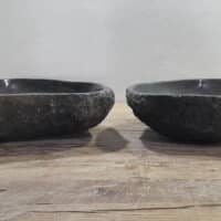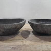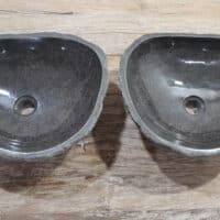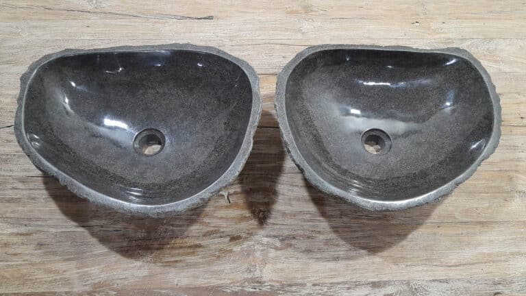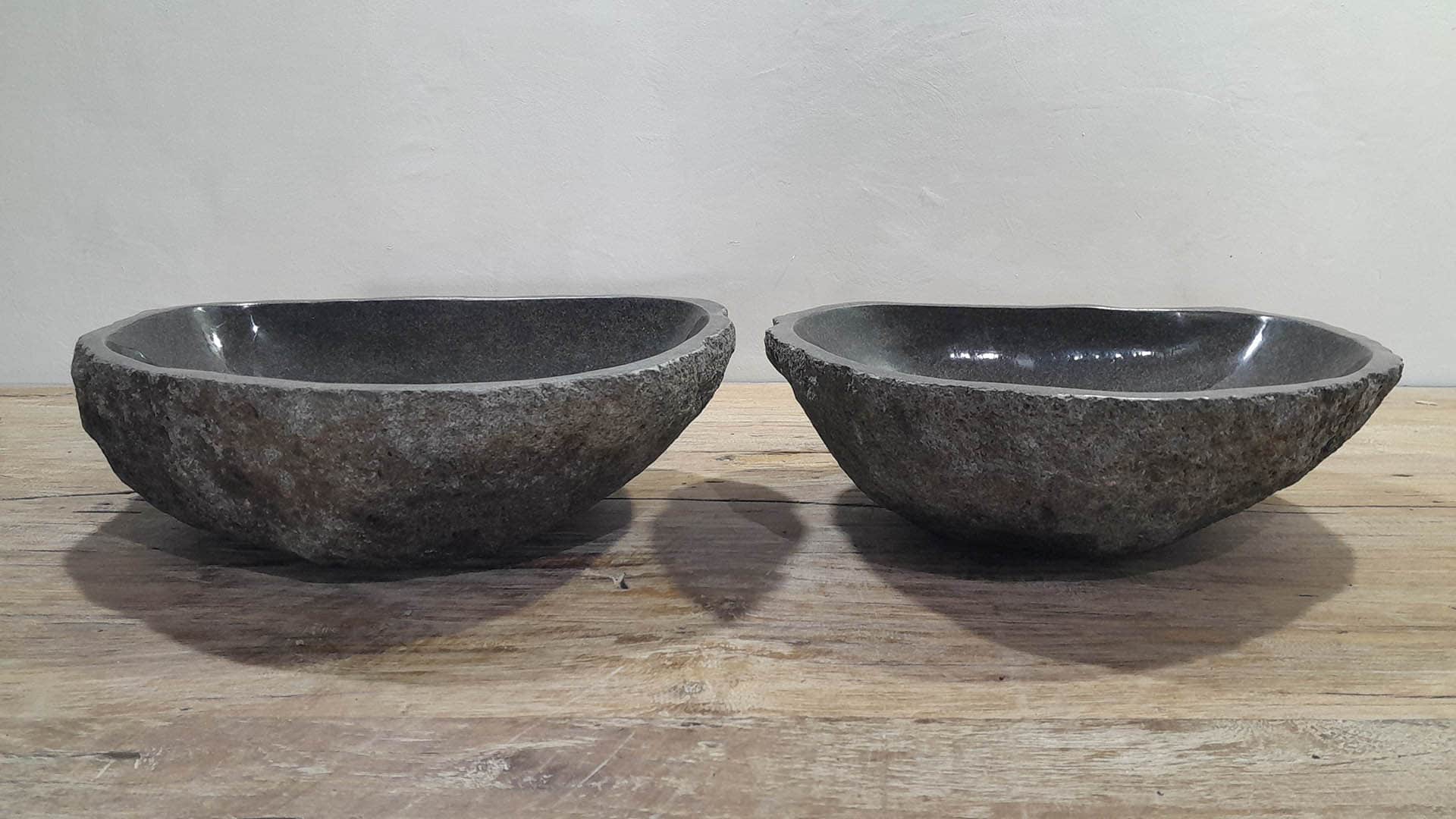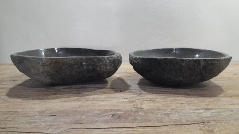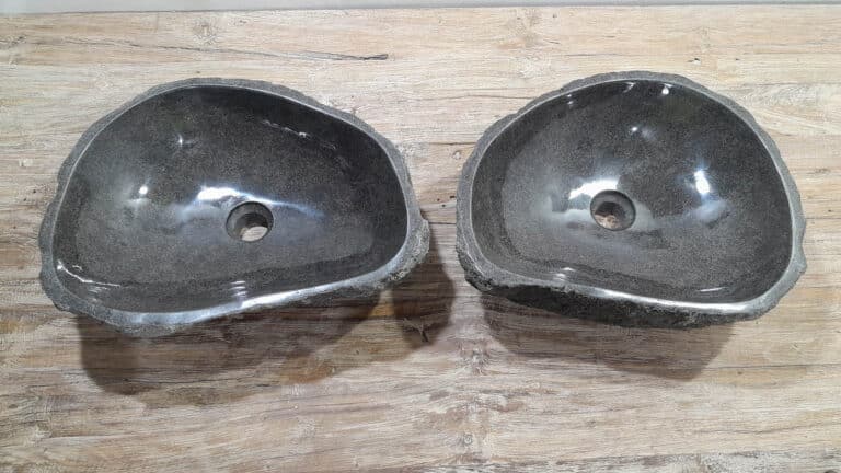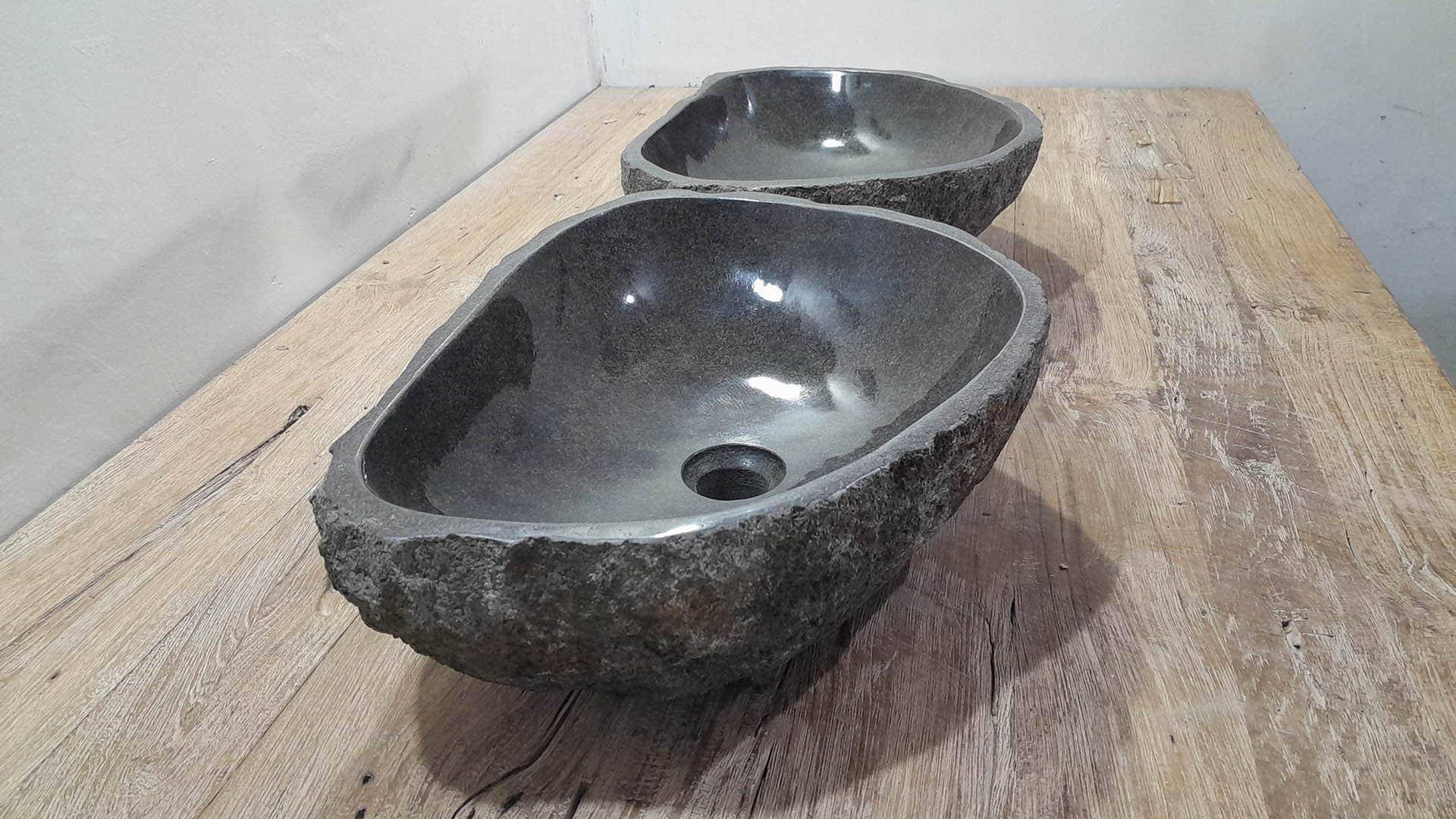 Mit diesem Flussstein Waschbecken Set holen Sie sich ein besonderes Naturprodukt in Ihr Zuhause. Das Set besteht aus zwei handgefertigten Becken, gefertigt aus einem einzigen Flussstein. So stimmen Farbe, Größe und Maserung perfekt überein, während beide Becken ihre eigene natürliche Variation behalten. Ideal für Ihren Doppelwaschtisch. Jedes Set wird vollständig von Hand aus massivem Naturstein hergestellt. Die Innenseite ist glatt poliert für optimale Wasserableitung und einfache Reinigung, während die Außenseite roh bleibt und den robusten, natürlichen Charakter bewahrt.