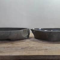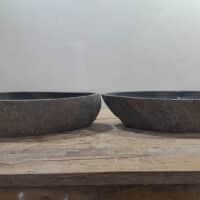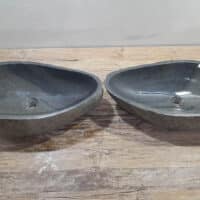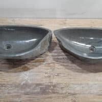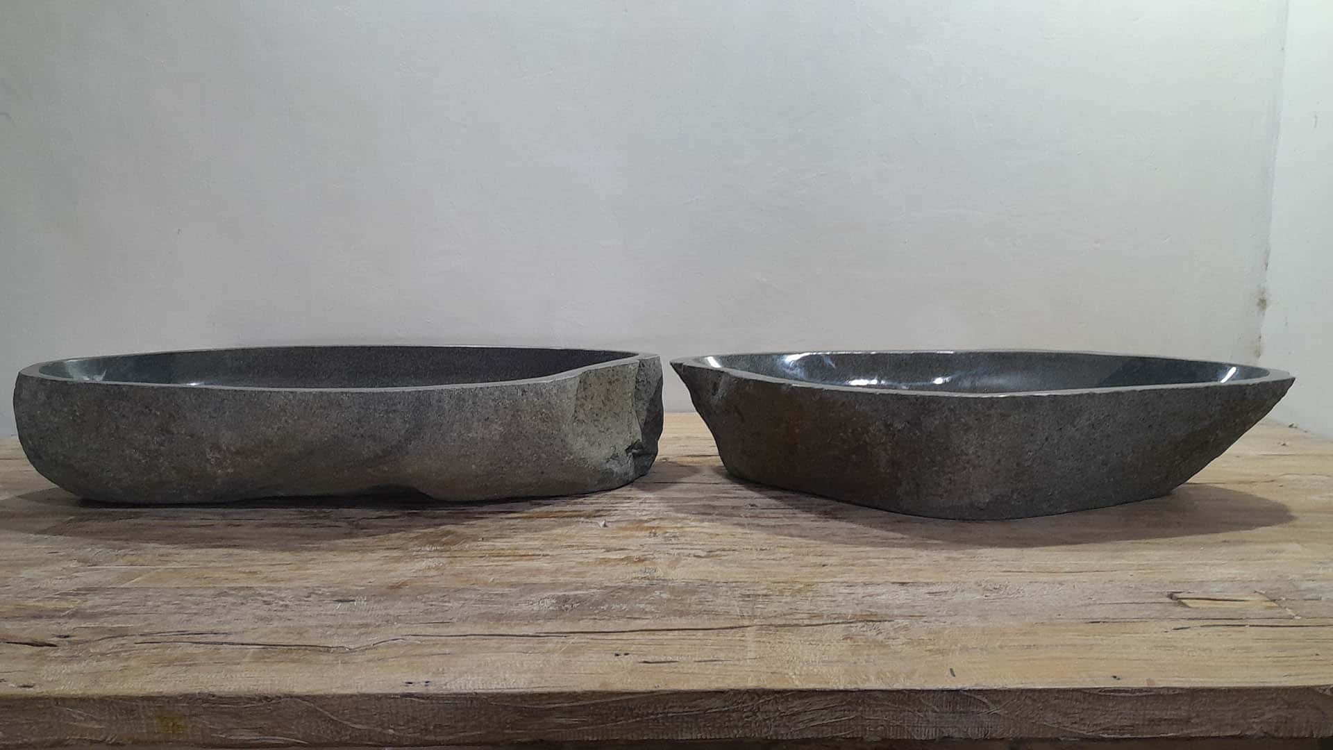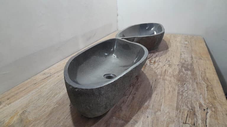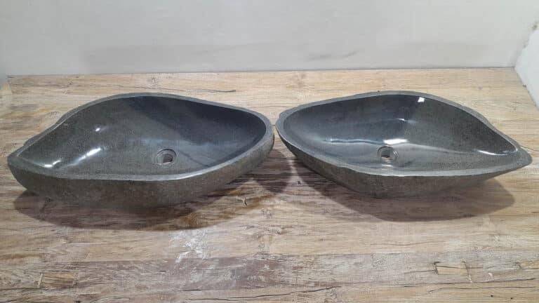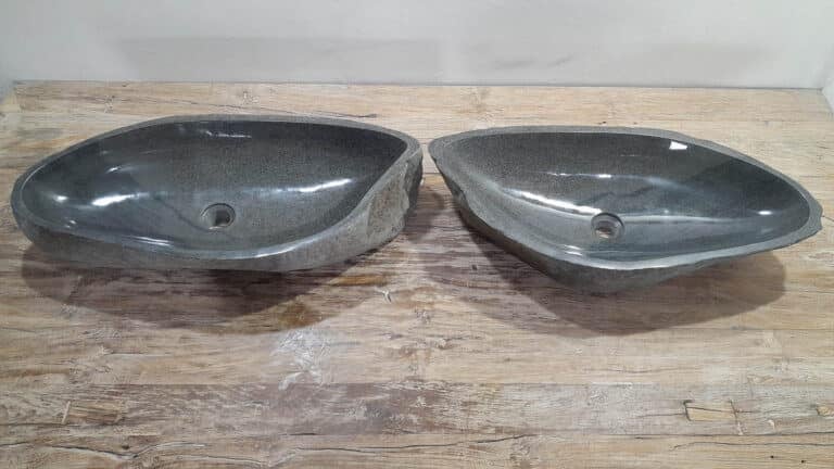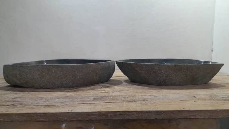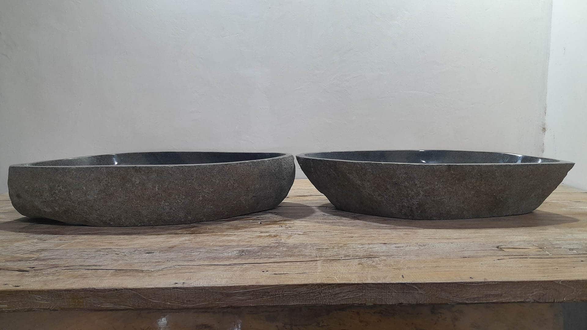Mit diesem Flussstein Waschbecken Set holen Sie sich ein besonderes Naturprodukt in Ihr Zuhause. Das Set besteht aus zwei handgefertigten Becken, gefertigt aus einem einzigen Flussstein. So stimmen Farbe, Größe und Maserung perfekt überein, während beide Becken ihre eigene natürliche Variation behalten. Ideal für Ihren Doppelwaschtisch. Jedes Set wird vollständig von Hand aus massivem Naturstein hergestellt. Die Innenseite ist glatt poliert für optimale Wasserableitung und einfache Reinigung, während die Außenseite roh bleibt und den robusten, natürlichen Charakter bewahrt.