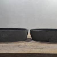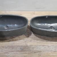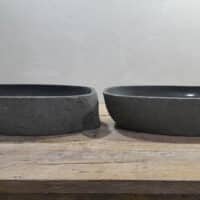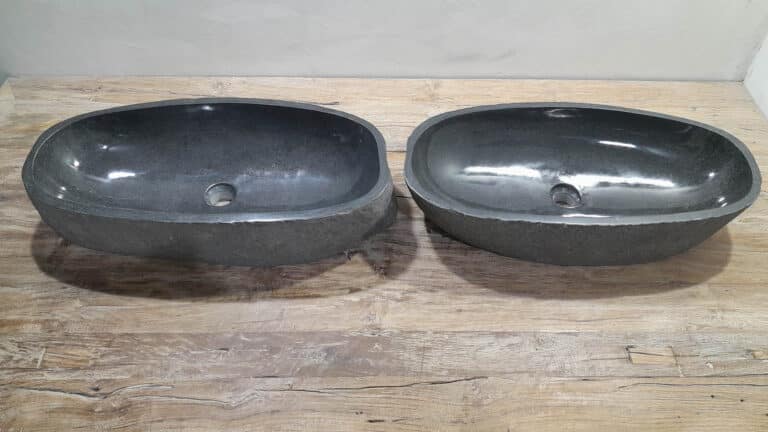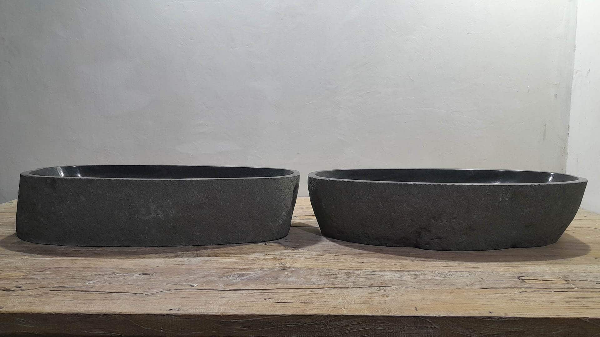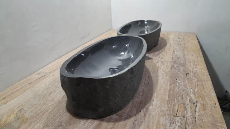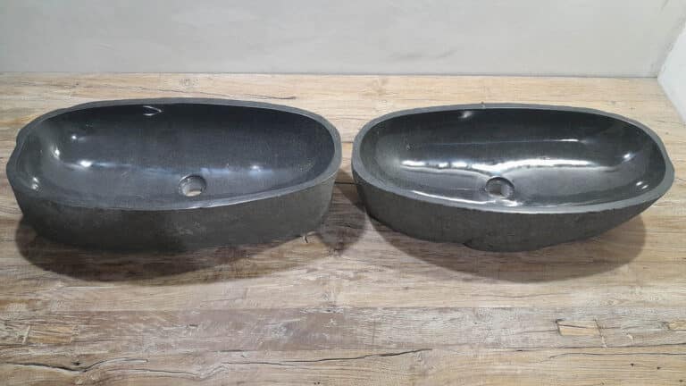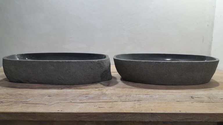 Mit diesem Flussstein Waschbecken Set holen Sie sich ein besonderes Naturprodukt in Ihr Zuhause. Das Set besteht aus zwei handgefertigten Becken, gefertigt aus einem einzigen Flussstein. So stimmen Farbe, Größe und Maserung perfekt überein, während beide Becken ihre eigene natürliche Variation behalten. Ideal für Ihren Doppelwaschtisch. Jedes Set wird vollständig von Hand aus massivem Naturstein hergestellt. Die Innenseite ist glatt poliert für optimale Wasserableitung und einfache Reinigung, während die Außenseite roh bleibt und den robusten, natürlichen Charakter bewahrt.
