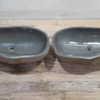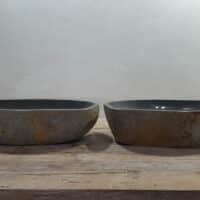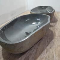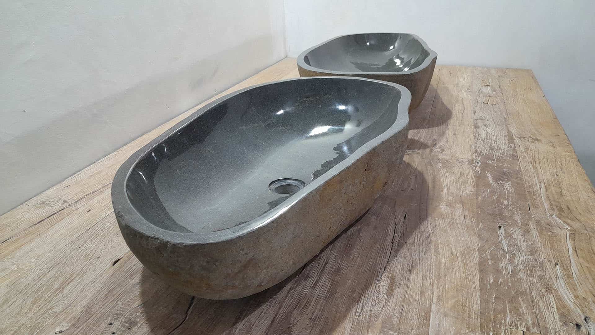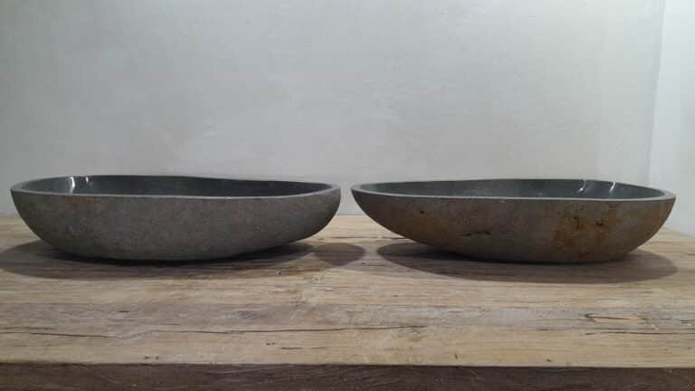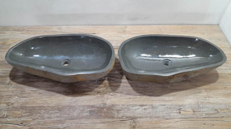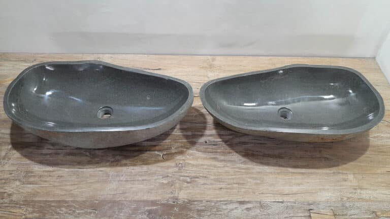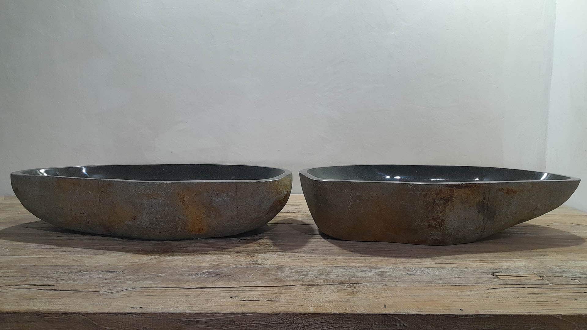 Mit diesem Flussstein Waschbecken Set holen Sie sich ein besonderes Naturprodukt in Ihr Zuhause. Das Set besteht aus zwei handgefertigten Becken, gefertigt aus einem einzigen Flussstein. So stimmen Farbe, Größe und Maserung perfekt überein, während beide Becken ihre eigene natürliche Variation behalten. Ideal für Ihren Doppelwaschtisch. Jedes Set wird vollständig von Hand aus massivem Naturstein hergestellt. Die Innenseite ist glatt poliert für optimale Wasserableitung und einfache Reinigung, während die Außenseite roh bleibt und den robusten, natürlichen Charakter bewahrt.