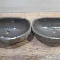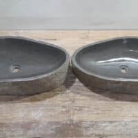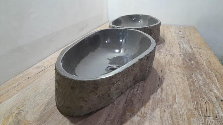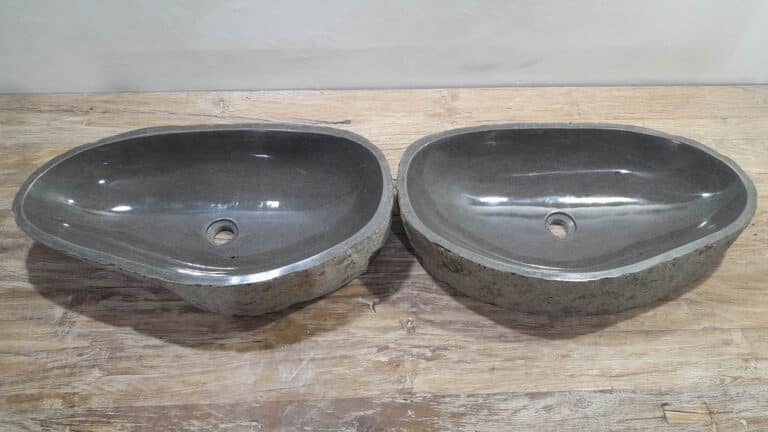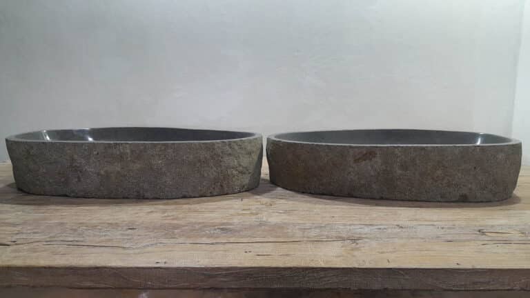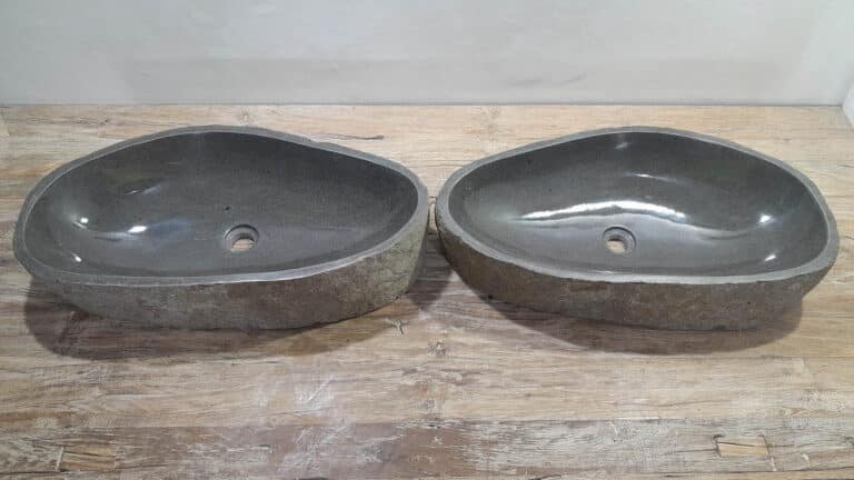 Mit diesem Flussstein Waschbecken Set holen Sie sich ein besonderes Naturprodukt in Ihr Zuhause. Das Set besteht aus zwei handgefertigten Becken, gefertigt aus einem einzigen Flussstein. So stimmen Farbe, Größe und Maserung perfekt überein, während beide Becken ihre eigene natürliche Variation behalten. Ideal für Ihren Doppelwaschtisch. Jedes Set wird vollständig von Hand aus massivem Naturstein hergestellt. Die Innenseite ist glatt poliert für optimale Wasserableitung und einfache Reinigung, während die Außenseite roh bleibt und den robusten, natürlichen Charakter bewahrt.
