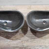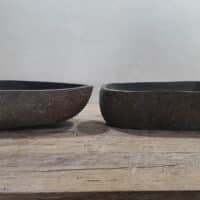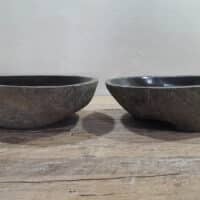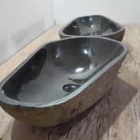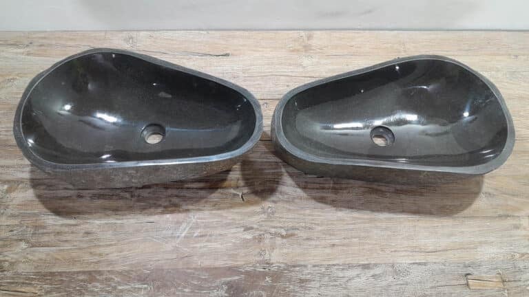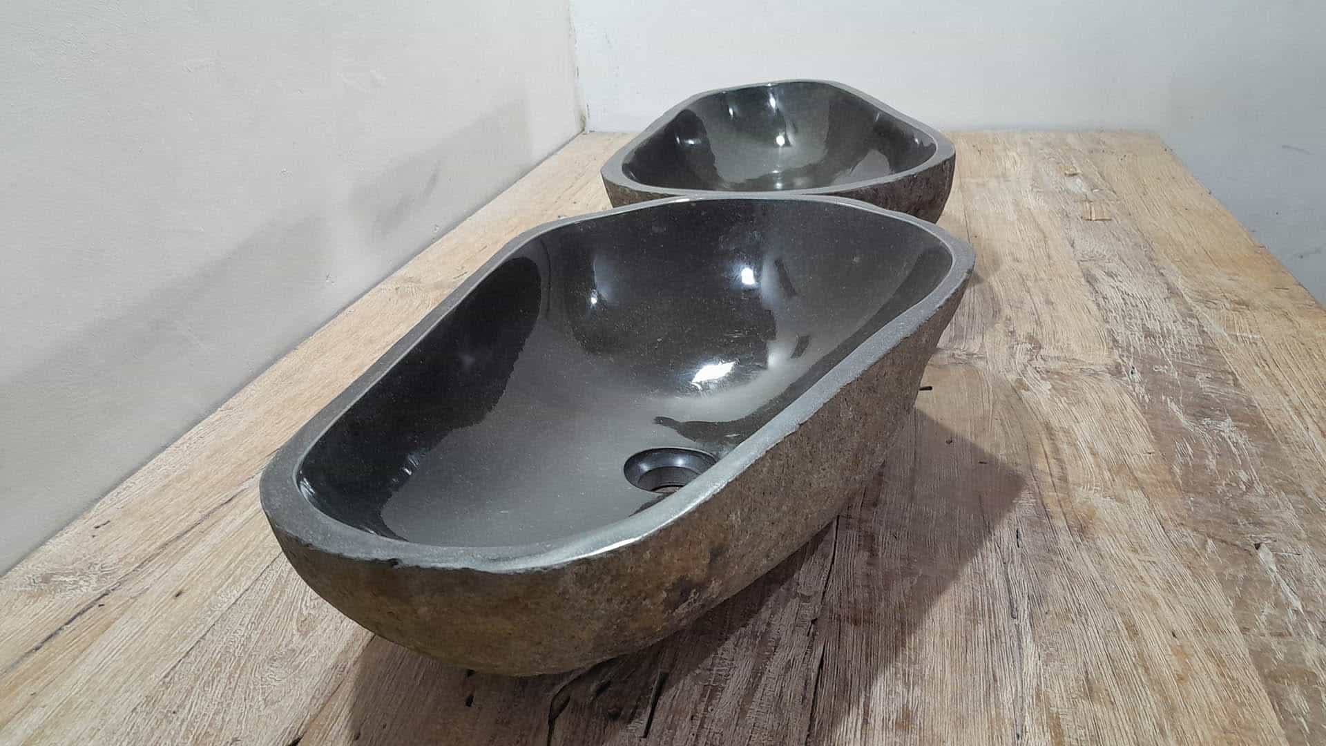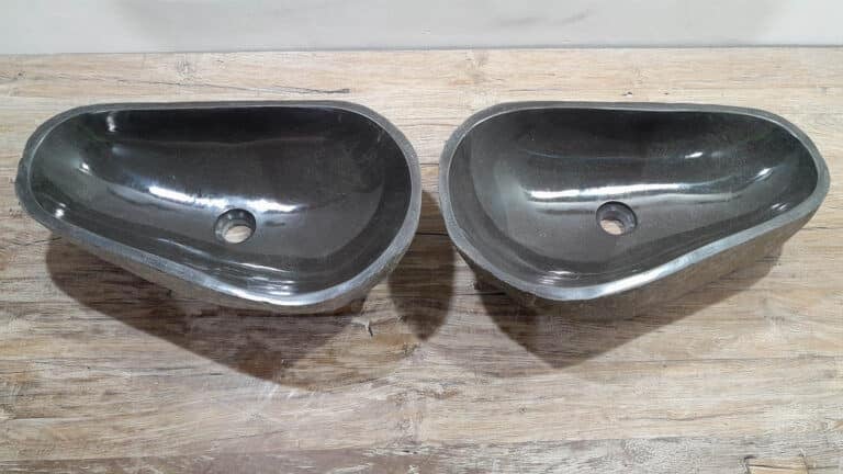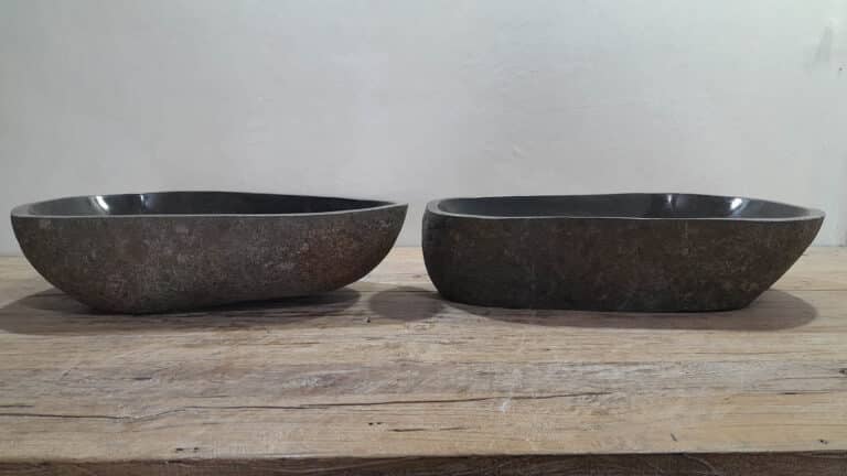 Mit diesem Flussstein Waschbecken Set holen Sie sich ein besonderes Naturprodukt in Ihr Zuhause. Das Set besteht aus zwei handgefertigten Becken, gefertigt aus einem einzigen Flussstein. So stimmen Farbe, Größe und Maserung perfekt überein, während beide Becken ihre eigene natürliche Variation behalten. Ideal für Ihren Doppelwaschtisch. Jedes Set wird vollständig von Hand aus massivem Naturstein hergestellt. Die Innenseite ist glatt poliert für optimale Wasserableitung und einfache Reinigung, während die Außenseite roh bleibt und den robusten, natürlichen Charakter bewahrt.